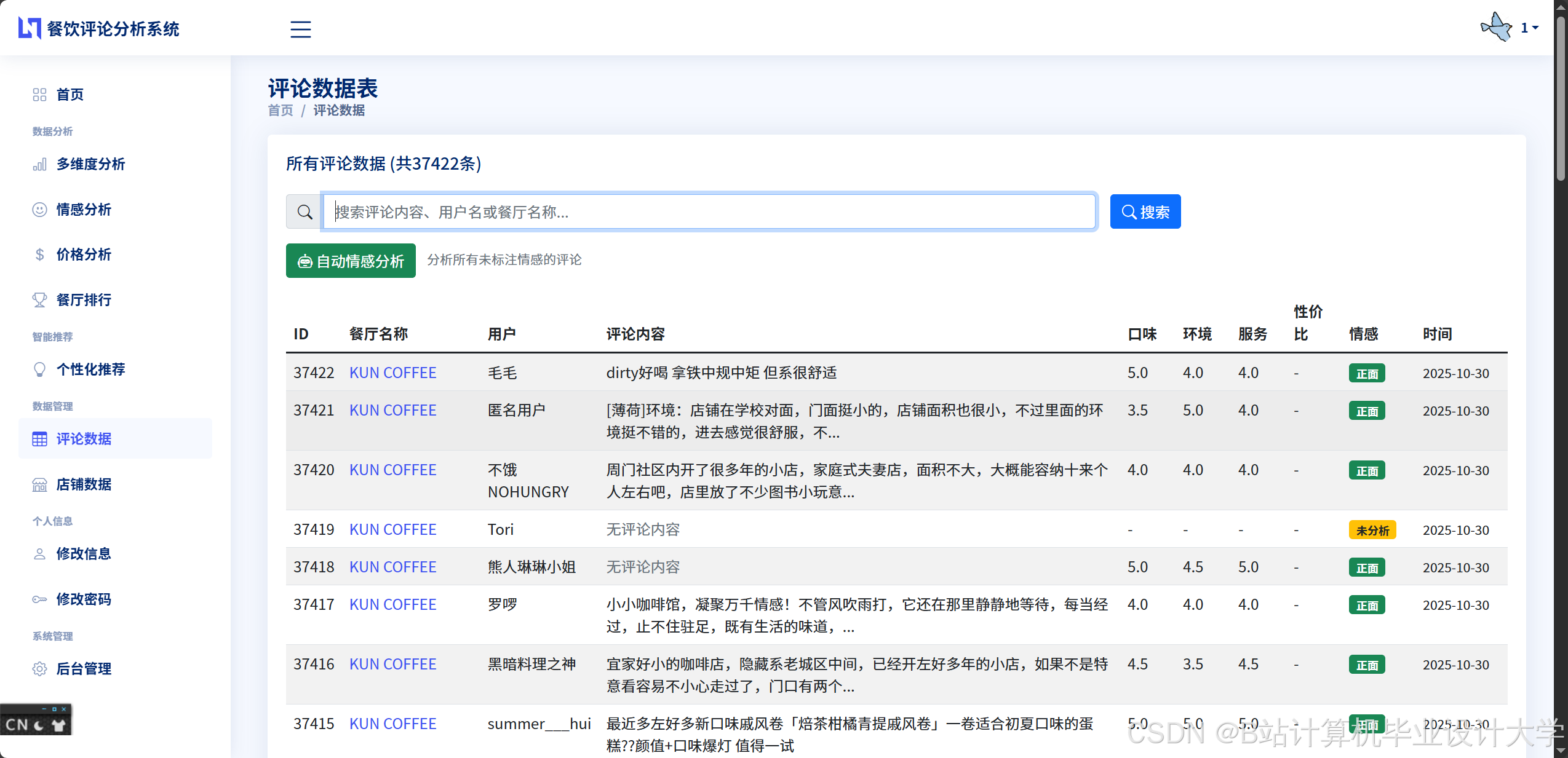 Streamlit或Django开发Web应用,支持用户输入偏好(口味、预算)并展示推荐结果。 - 后端服务:基于Flask/FastAPI构建API,调用情感分析模型与推荐算法。