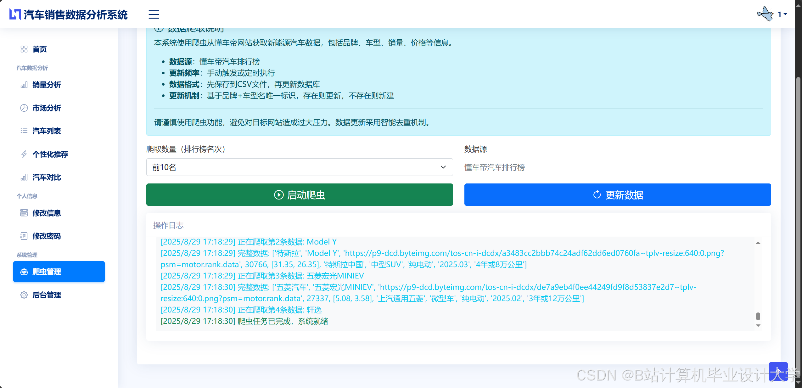 - 系统架构设计:典型系统采用“前端-后端-数据层”三层架构。前端以Vue.js+Element Plus构建交互界面,后端基于Django提供API服务与业务逻辑处理,数据层通过MySQL存储结构化数据,并利用Scrapy爬虫实时抓取懂车帝、车质网等平台的数据,补充非结构化信息(如用户评论、投诉)。例如,某系统通过Scrapy爬取懂车帝近一年销量数据与车质网投诉数据,结合Django的定时任务模块,实现数据每日更新与清洗。