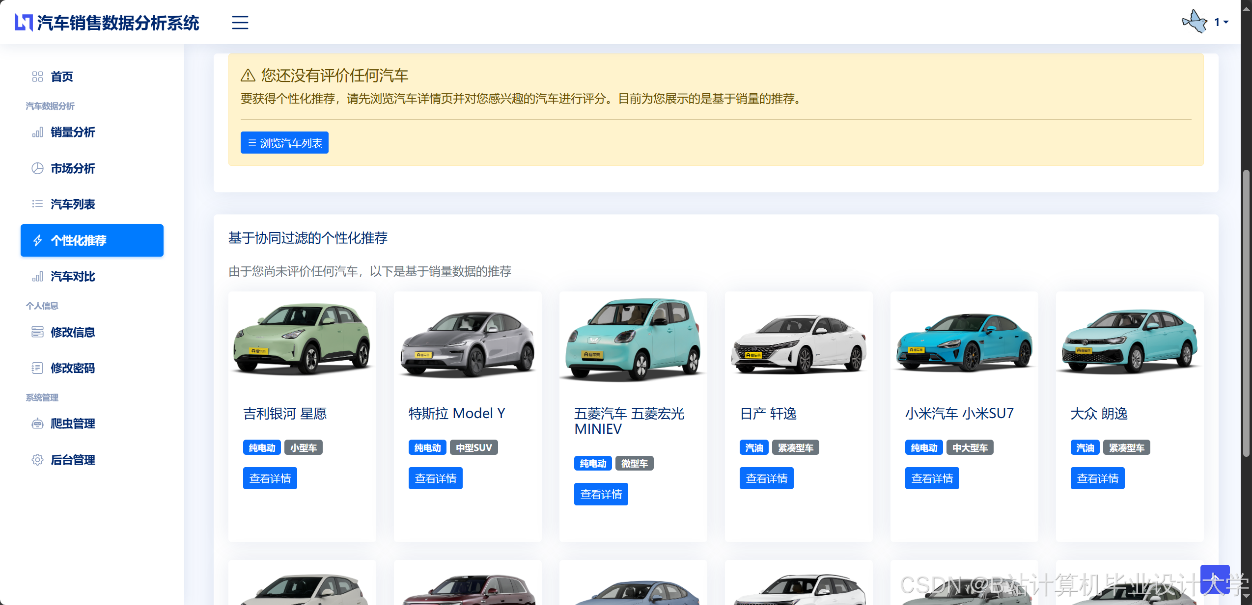- 交互式大屏:基于ECharts构建可视化平台,实时展示销售趋势、用户分布、推荐效果等指标。例如,通过地理热力图显示各城市新能源汽车销量占比,辅助区域营销策略制定。