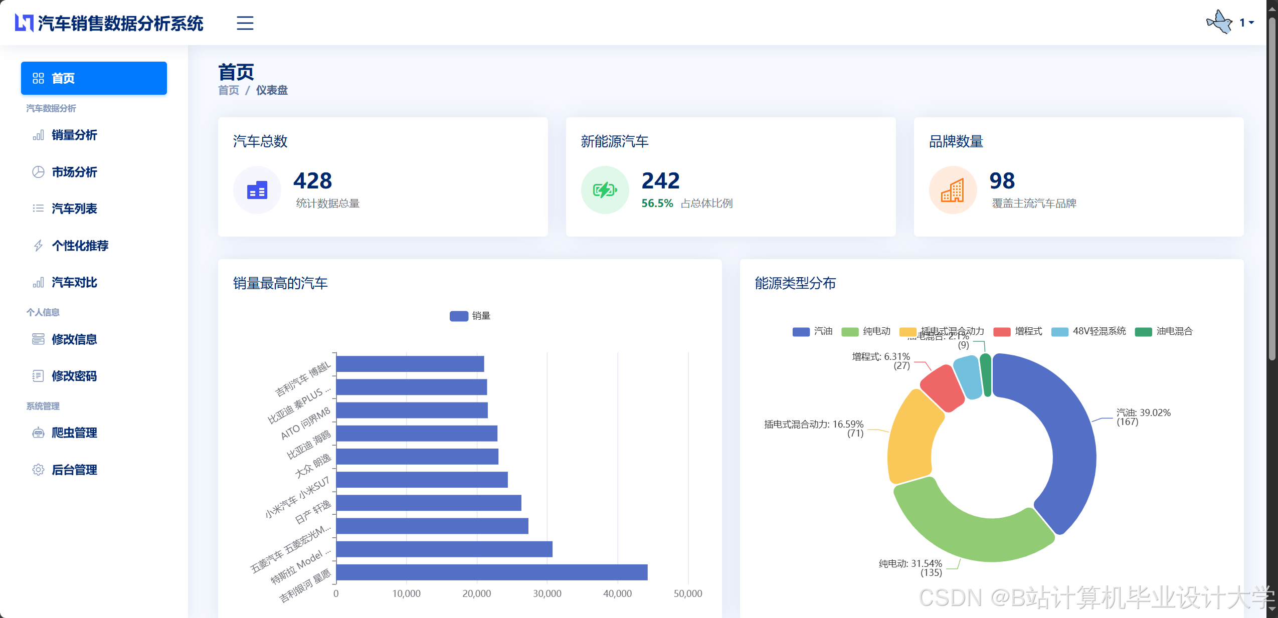 - 车企决策支持:通过销量分析模块识别市场趋势(如纯电车型占比逐年上升),辅助车企调整产品规划。例如,某车企根据系统预测结果,将2026年纯电车型研发预算占比从40%提升至60%。