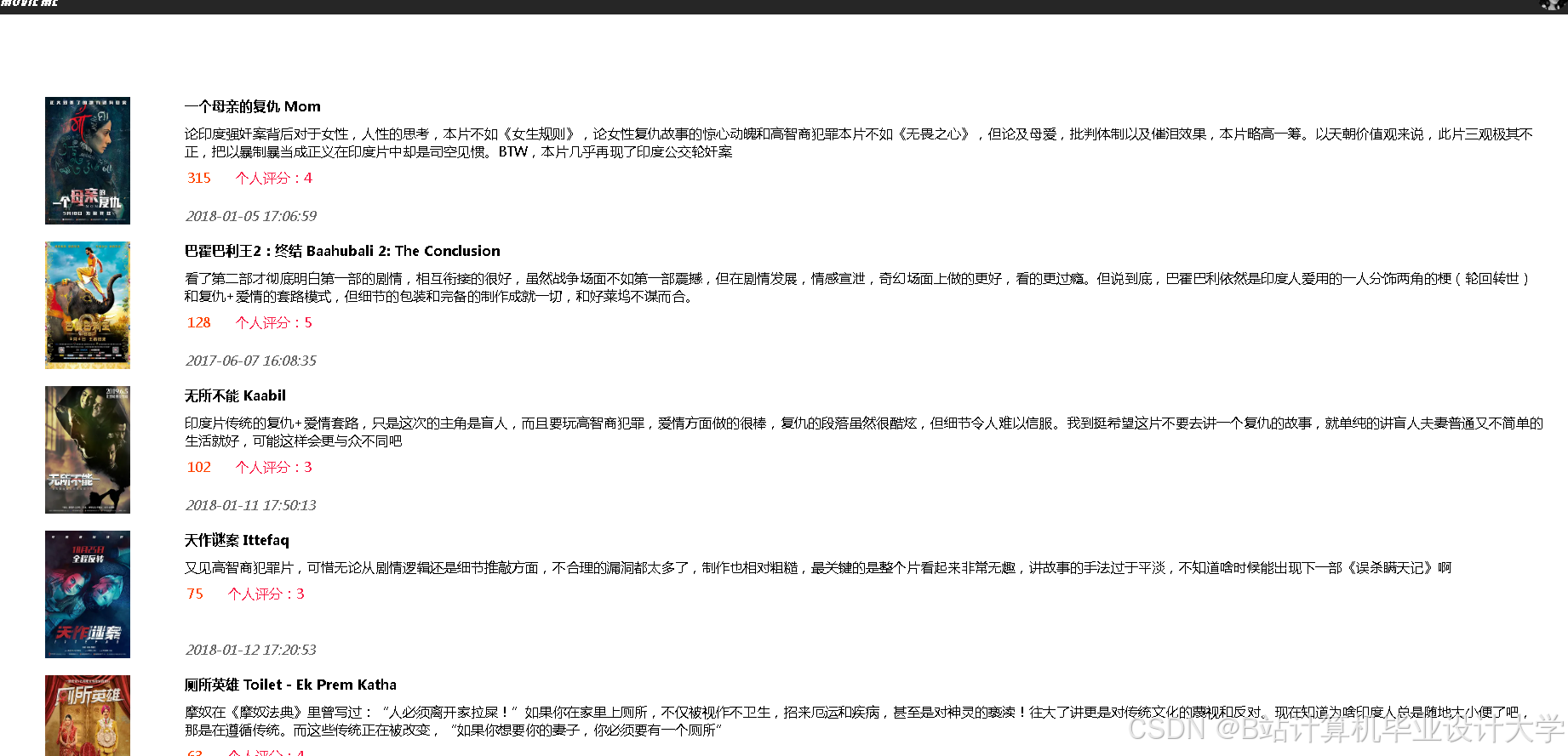- 数据采集层:基于Kafka实时采集用户行为数据,消息格式为JSON,包含user_id、movie_id、rating、timestamp等字段。同时,使用Scrapy框架抓取电影元数据,如标题、类型、导演、评分等。例如,从豆瓣电影页面解析导演信息时,采用XPath表达式提取数据。日志采集则部署Flume Agent,配置相应的source、channel和sink,将用户行为日志采集并发送至Kafka。