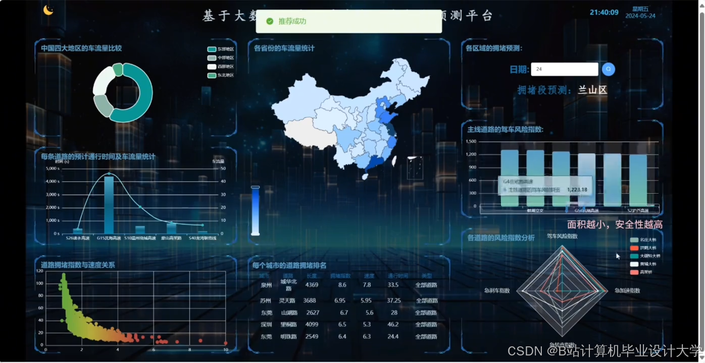 - 前端可视化:基于ECharts和Leaflet构建可视化平台,展示实时交通地图(如热力图显示拥堵程度)、流量趋势图(如折线图展示历史与预测流量)和预警信息(如红色标注预计拥堵路段),支持用户交互(如缩放、筛选时间段)。