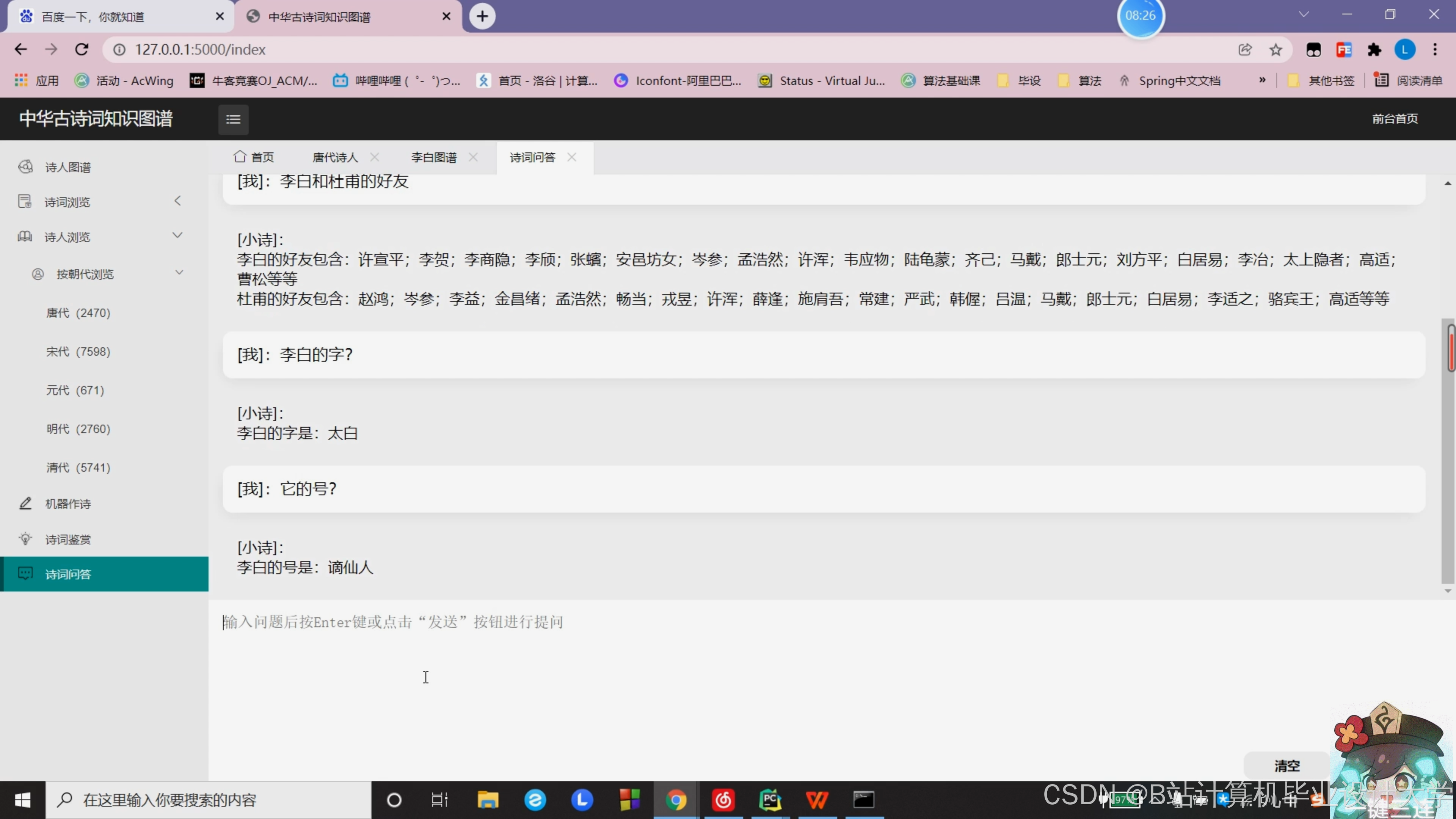 - 智能问答面板:用户输入问题(如“李白的诗中有哪些关于友情的诗句?”),调用后端接口返回结果。