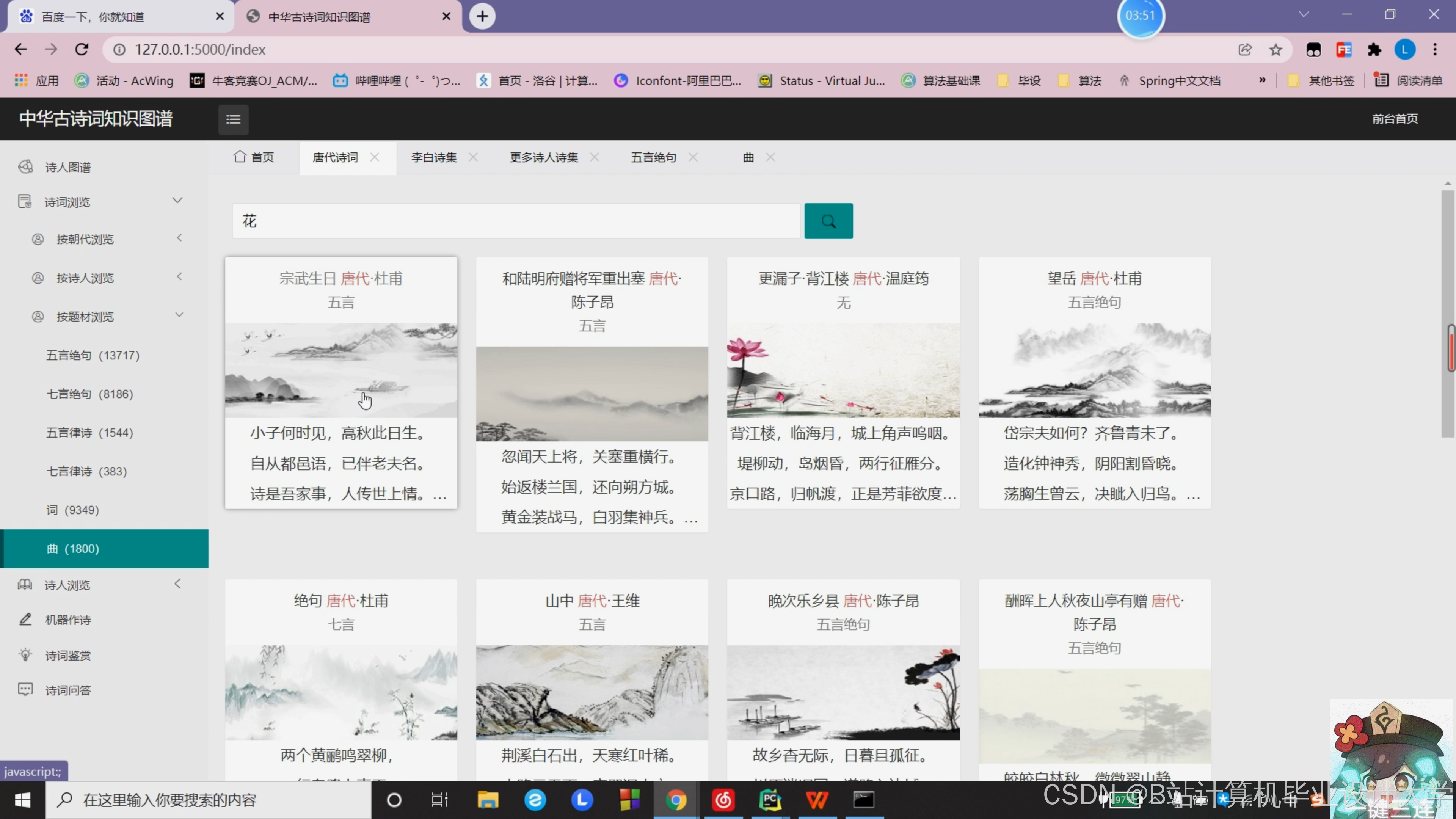 中华古诗词作为中华文化的瑰宝,承载着丰富的历史记忆与情感内涵。然而,传统纸质媒介的传播局限性与现代学习者对数字化内容的需求矛盾日益凸显。据统计,我国现存可考古诗词超过50万首,但仅12%的诗词通过数字化平台被公众接触。本项目旨在通过Django框架与DeepSeek大模型的结合,构建中华古诗词知识图谱可视化系统,实现古诗词知识的结构化存储、语义理解与动态可视化展示,为古诗词研究与教育提供智能化工具。
