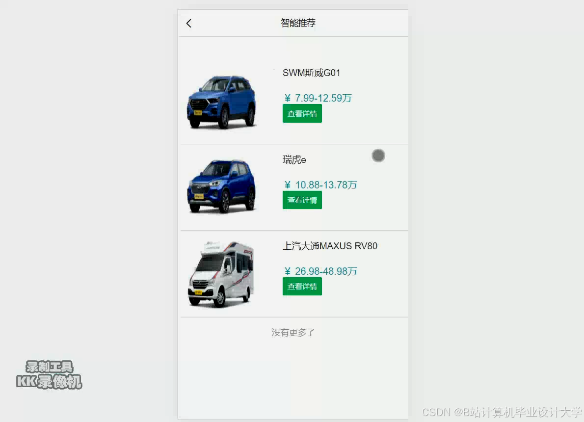 - 应用层:通过Spring Boot提供RESTful API,前端通过Vue.js+ECharts展示推荐结果(如车型排行榜、个性化推荐列表),Redis缓存高频查询结果。