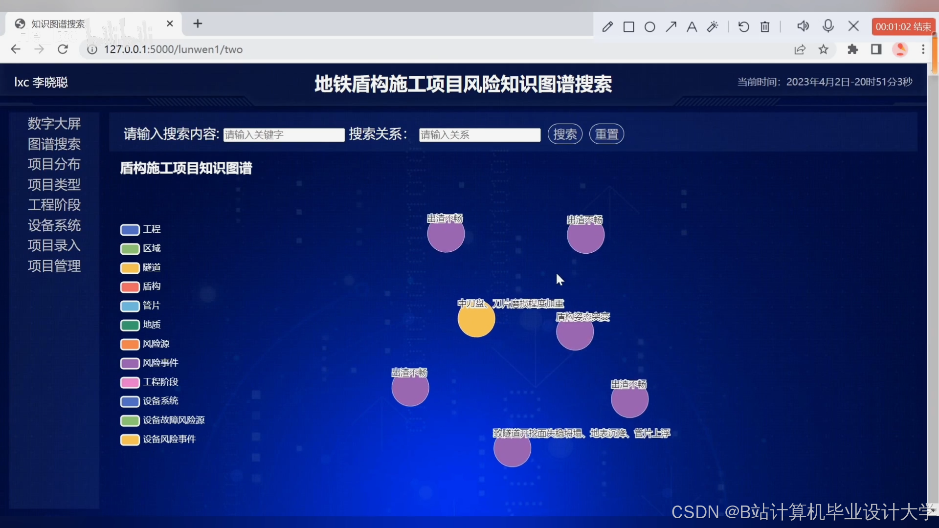 地铁盾构施工涉及地质条件复杂、设备故障率高、环境影响大等风险因素,传统风险分析依赖人工经验,难以全面挖掘风险关联关系。知识图谱技术可通过结构化存储风险实体(如设备、地质、人员)及其关系,结合可视化技术实现风险动态预警与决策支持。 -