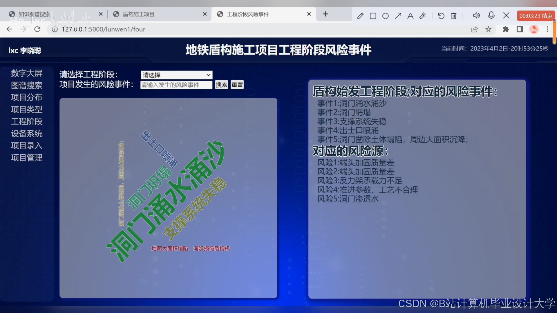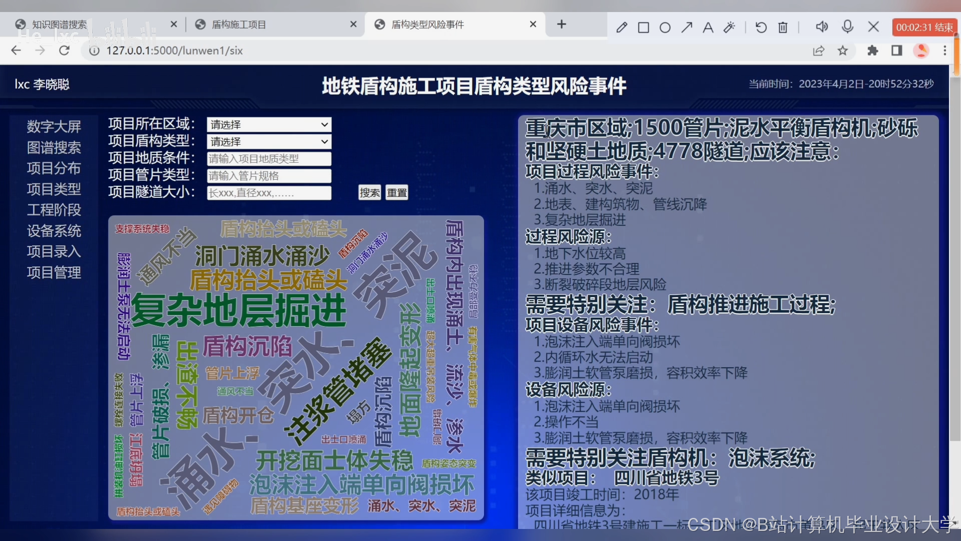 地铁盾构施工是城市轨道交通建设的核心技术环节,其施工过程涉及地质条件、设备状态、人员操作等200余项风险因素。传统风险分析依赖专家经验与静态表格,难以揭示风险因素间的复杂关联关系。本系统基于Python数据科学与Neo4j图数据库技术,构建动态风险知识图谱,实现风险因素关联可视化、传播路径模拟及智能预警,助力工程管理人员快速定位风险源头并制定防控措施。