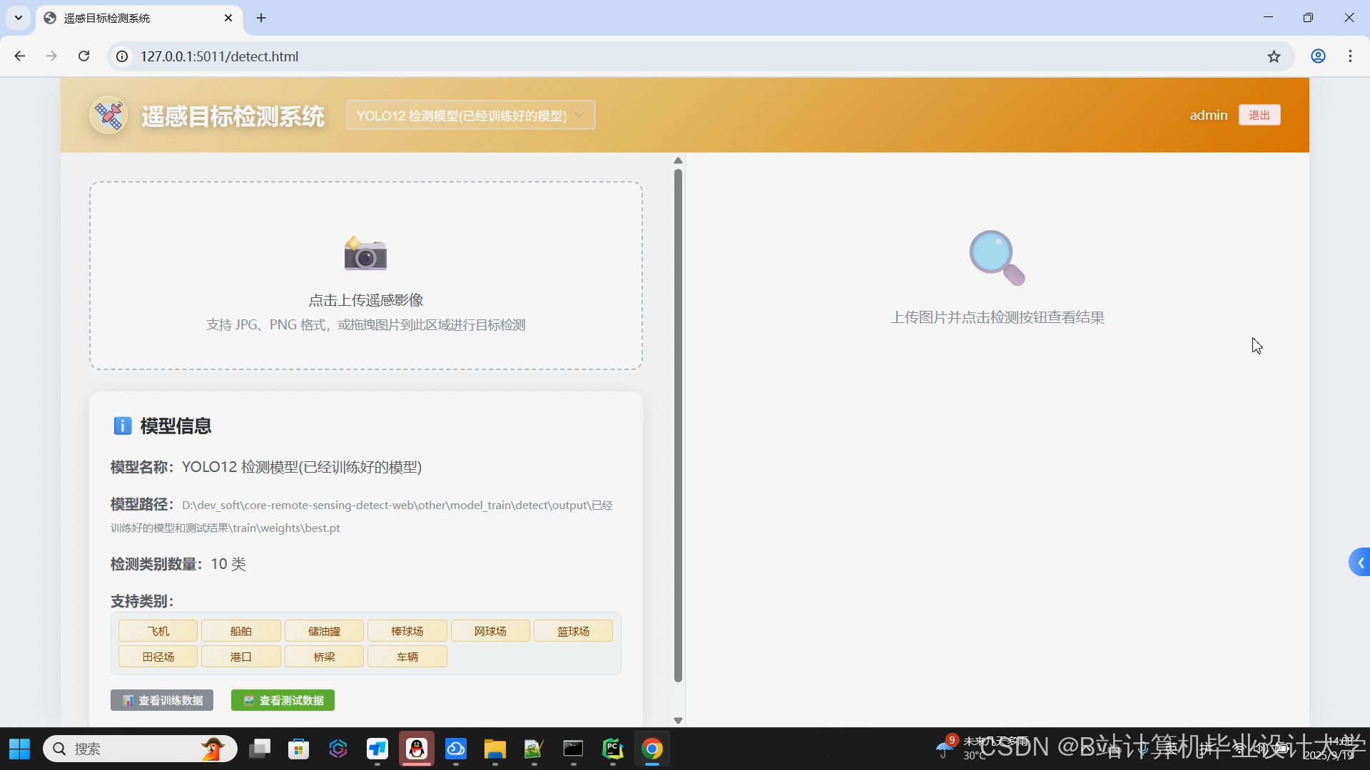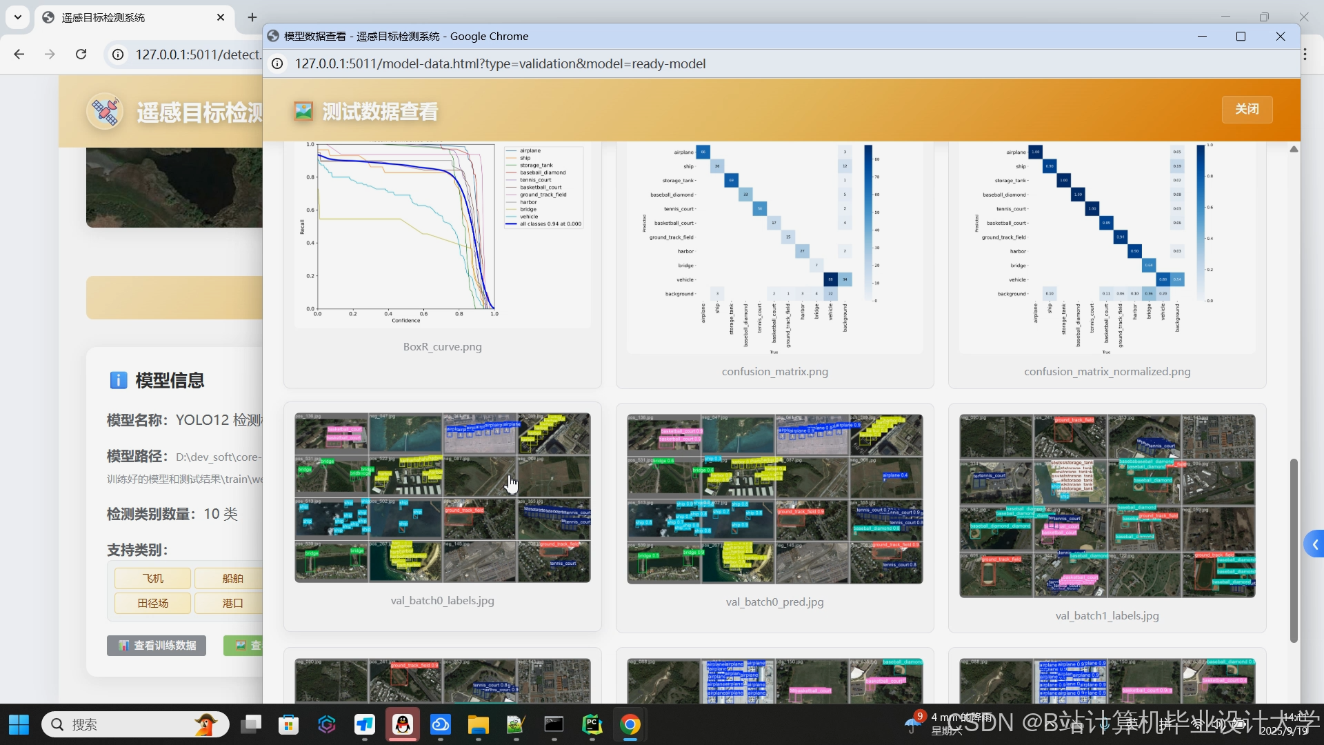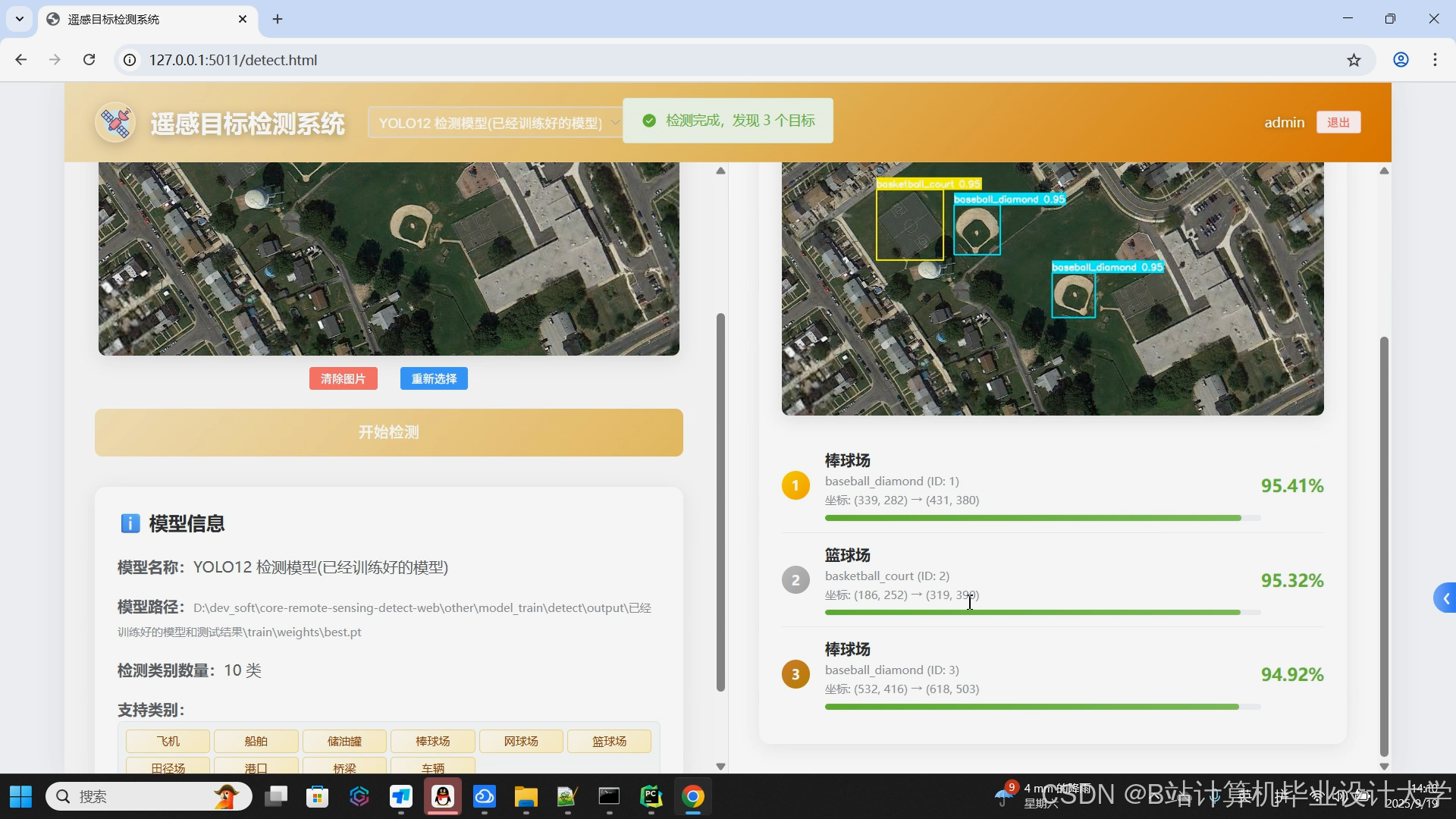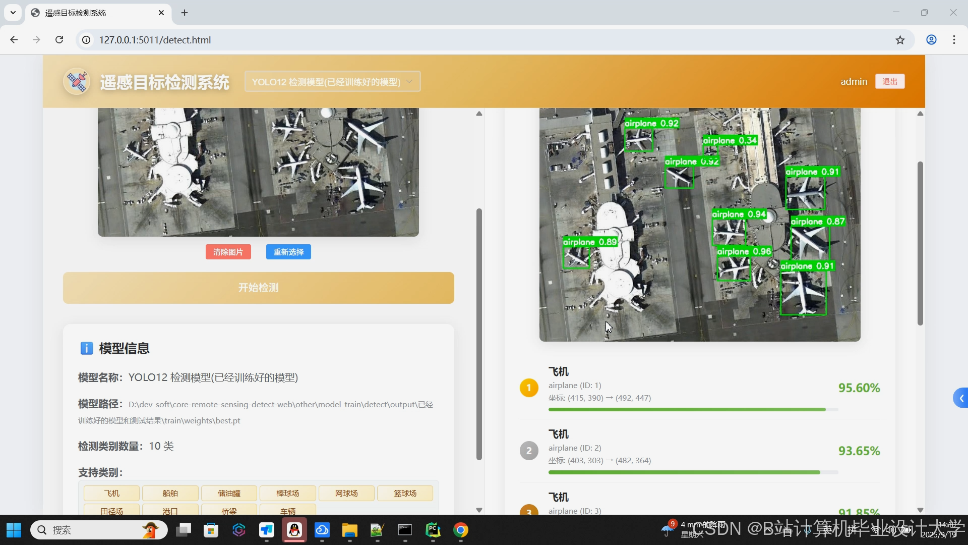 - 推理检测:提供图片、视频及实时摄像头检测模式,支持多目标分类(如飞机、船舶、储油罐等10类遥感目标)与定位(边界框坐标、置信度)。例如,YOLOv11-X模型在飞机检测任务中mAP@0.5:0.95达68.4%,较Faster R-CNN提升12.3个百分点。