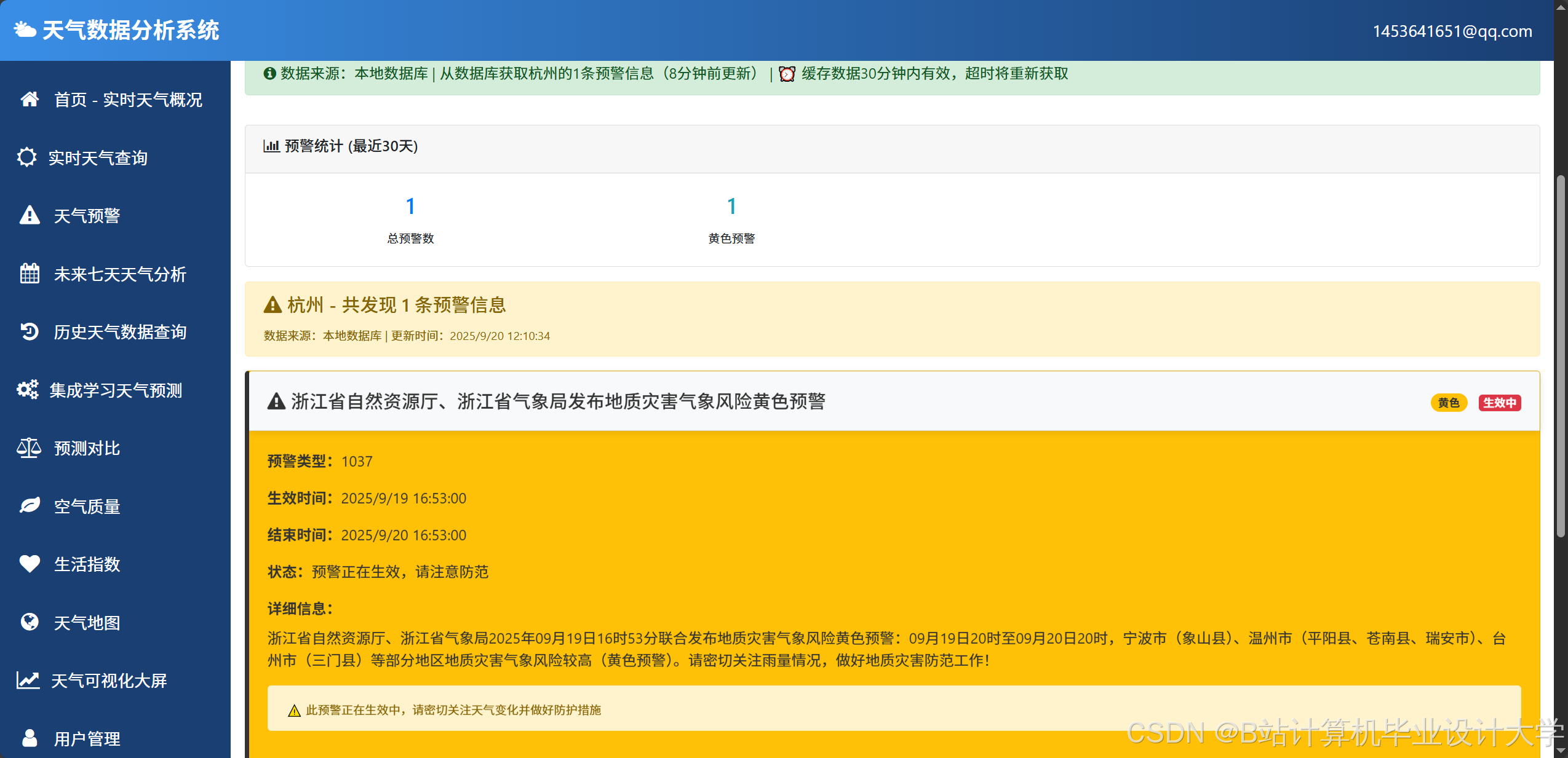 - 预警信息表:存储预警级别、发布时间、影响范围(地理坐标)。