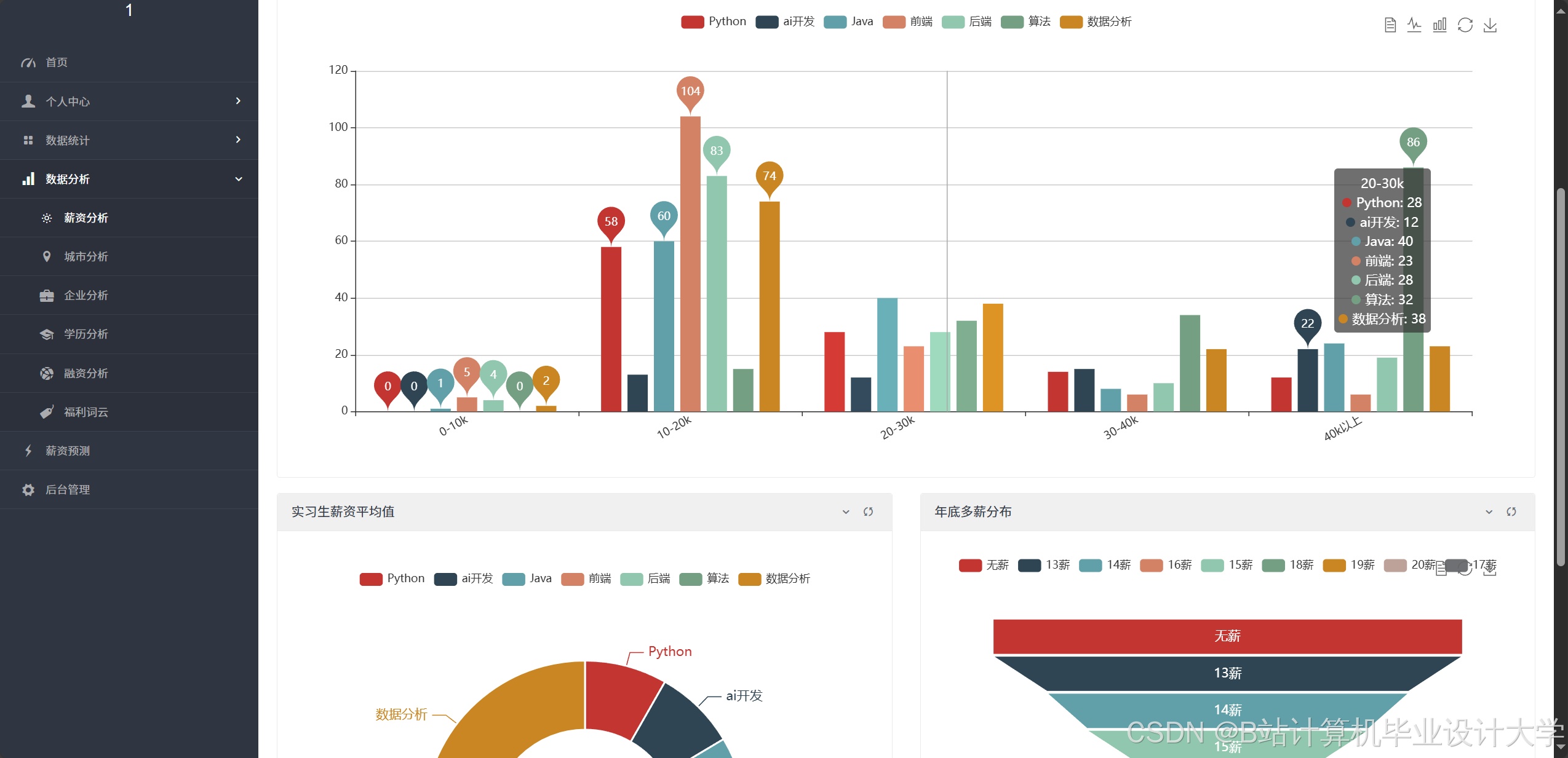- 薪资分布热力图:按城市、行业、经验年限展示薪资水平。