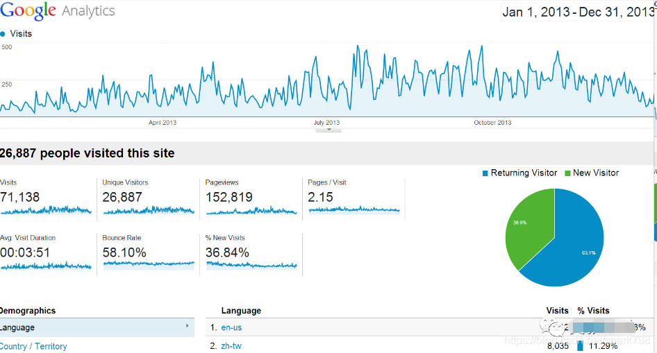 例如,Google Analytics是一个网站流量分析工具,它统计每个用户使用搜索引擎访问网站的数据,然后得到每个网站的流量信息,包括网站每天的访问次数,访问量最多的页面、用户的平均停留时间、回访率等,所有数据都以图形的方式,直观地显示出来,如图1-2所示