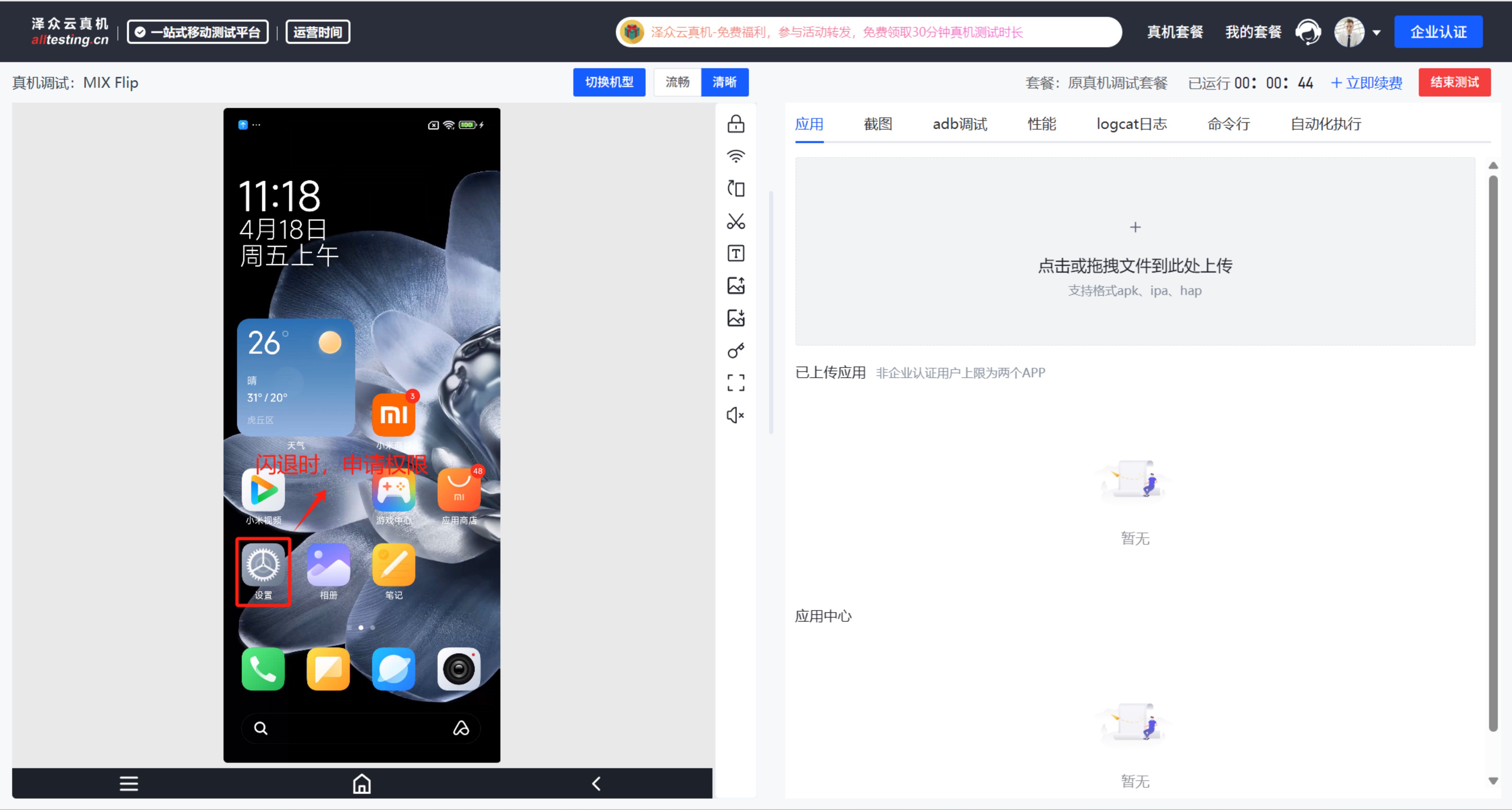 有些小伙伴,在测试自己应用时,有时候在进入机型设置界面,获取一些特殊的权限,发现打开设置时出现闪退,自动回到home按键主界面,新人操作会疑惑,为什么?因线上所有机型都是共享使用,从安全角度考虑,我们默认屏蔽了进入设置的权限,如您需要进入,可以直接联系在线客服或者技术支持帮您开通权限,不会影响大家测试,用完告知我们进行收回权限。