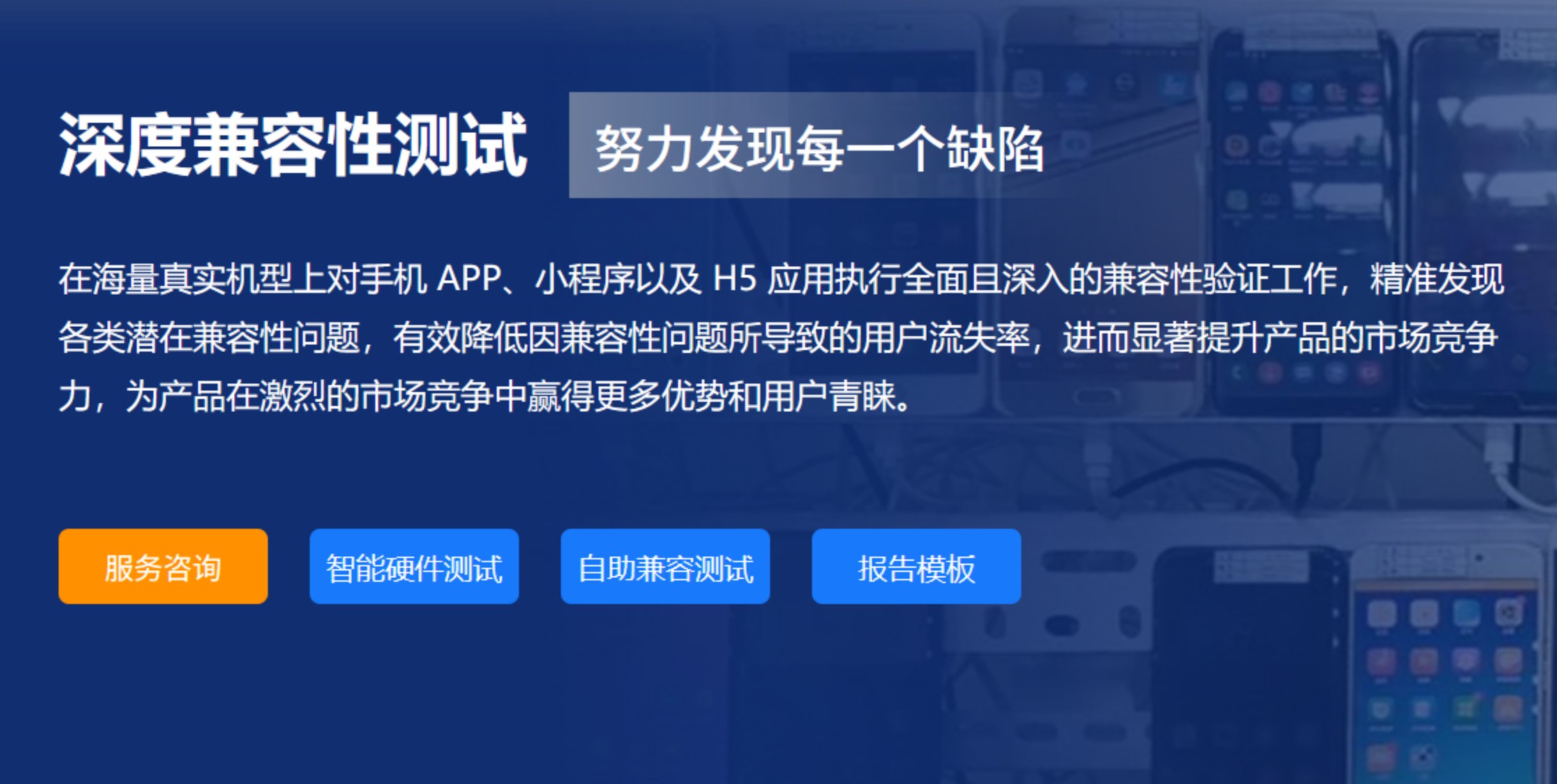 用户需求是测试智能硬件,包括App有生物识别场景,如人脸、指纹、语音、瞳孔等应用场景,平台无法自助测试,这个需求属于深度兼容性测试,泽众云可以提供专业技术团队根据用户测试需求来定制测试服务,在海量(1000+机型)真实机型上对手机 APP、小程序以及 H5 应用执行全面且深入的兼容性验证工作,精准发现各类潜在兼容性问题,针对缺陷机型提供免费回归测试服务。