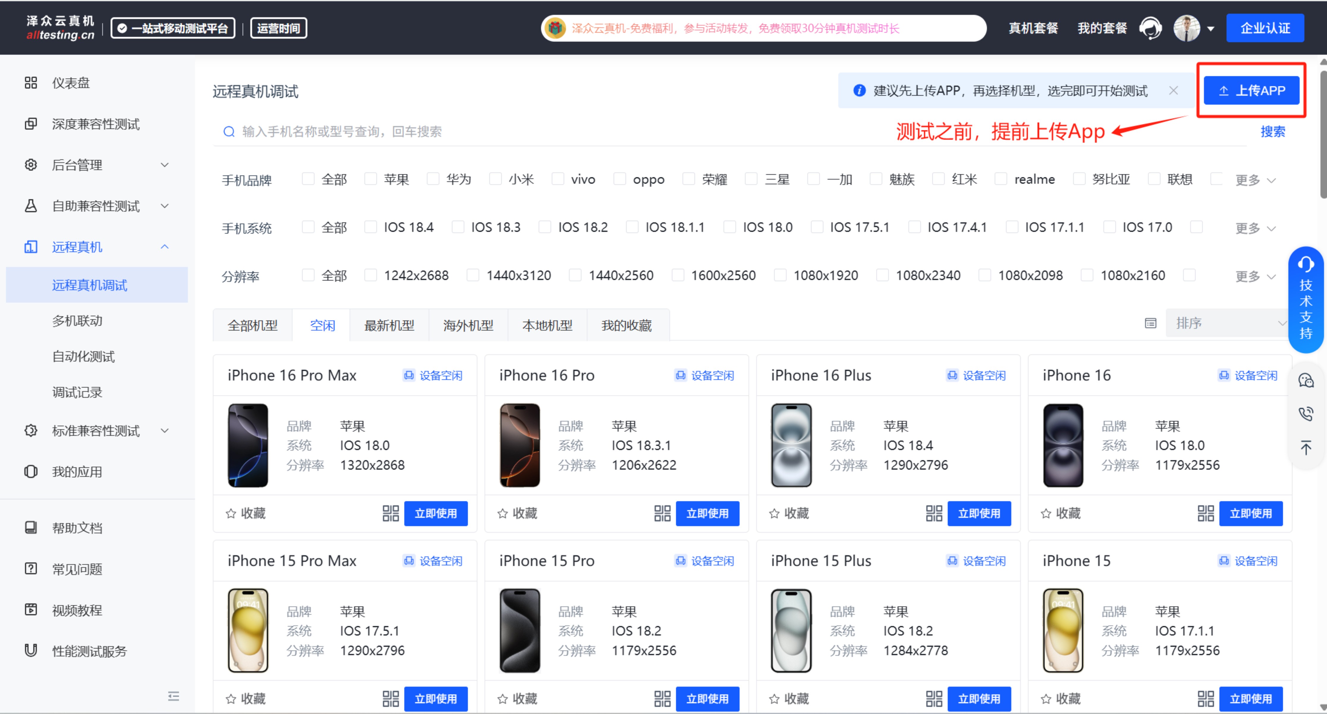 平台是支持预上传功能,意思就是在准备测试之前,你可以先上传App,此时也无需消耗时长,上传完成之后,用户再选择测试机型,正常测试即可,30分钟对个单台机型测试,时长足够使用的。