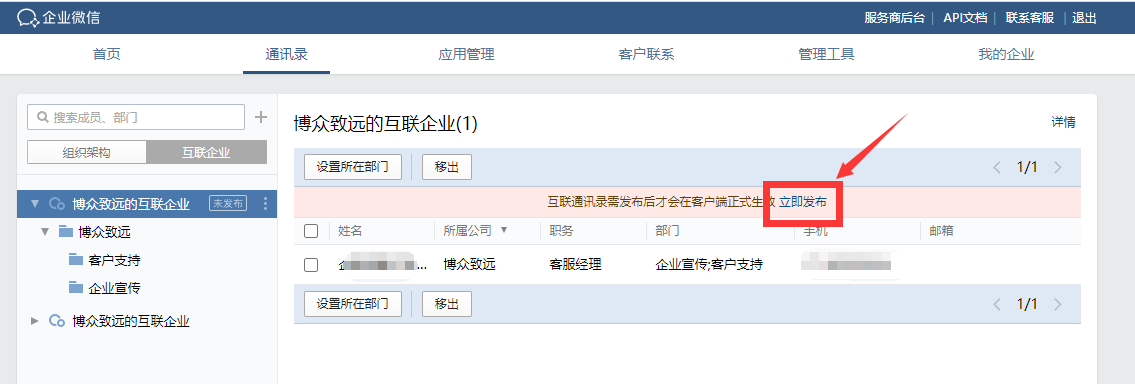 当双方都加入后,就可以选择需要互联的通讯录范围了。当双方都选择好互联通讯范围后,创建者在企业微信管理后台中点击发布,互联关系才会正式成立。
