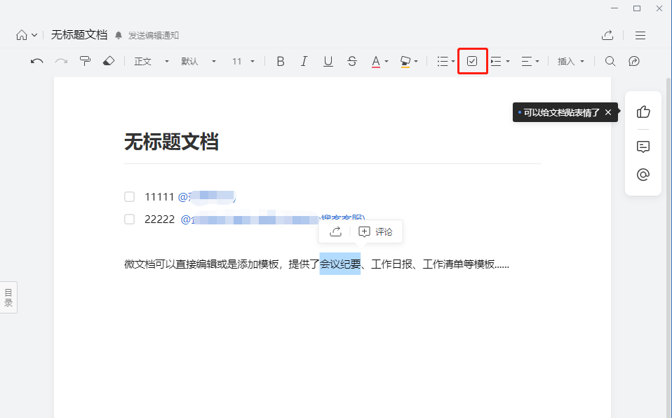 企业微信的微文档里提供了会议纪要、工作日报、工作清单等模板供企业使用。在文档中,还可以对任务进行分配,邀请同事完成,只需点击“任务列表”图标,即可@同事,操作十分方便。并且,在企业微信中就可以直接共同编辑微文档,无需来回跳转使用其他工具。