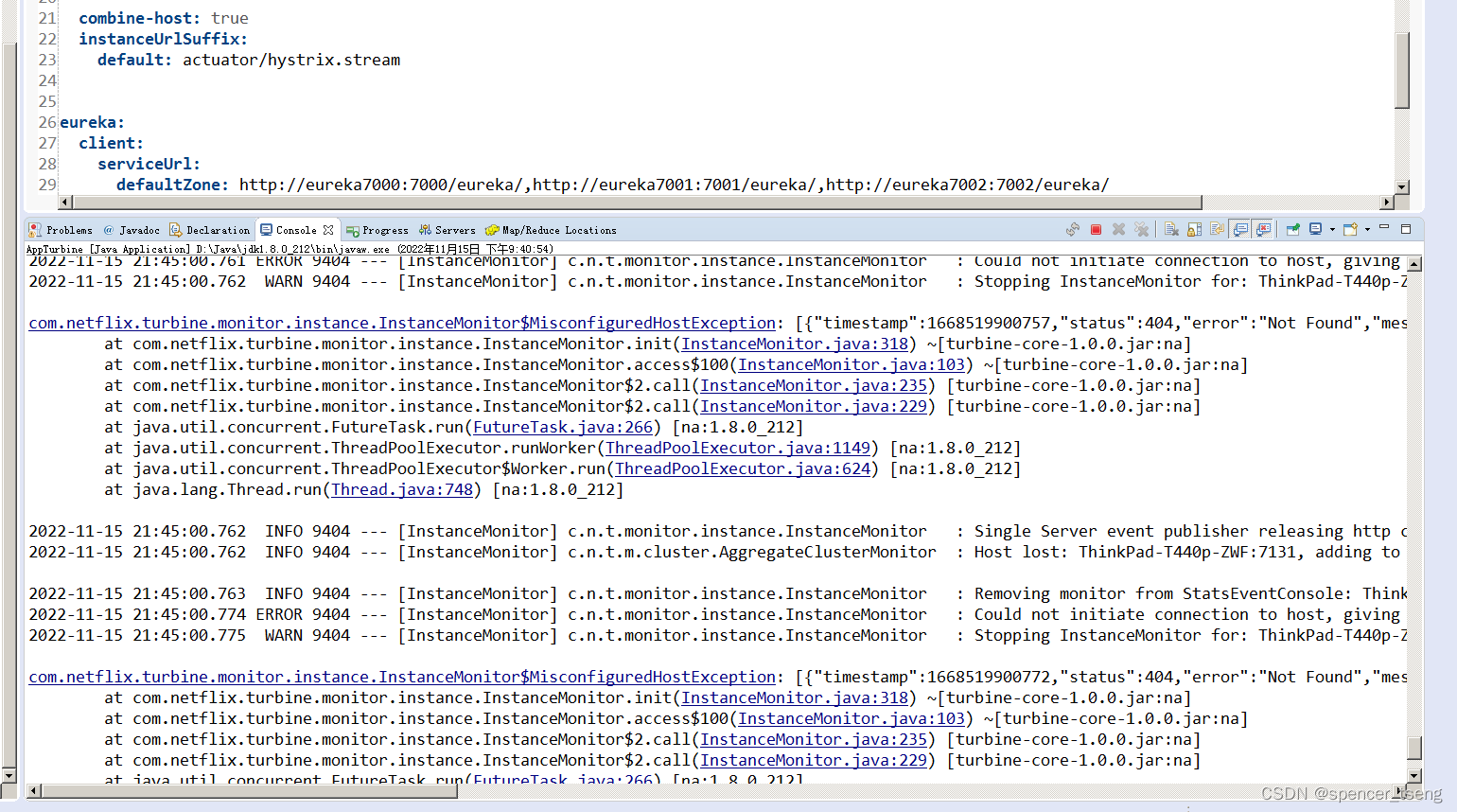 2022-11-15 21:45:00.756 INFO 9404 --- [InstanceMonitor] c.n.t.monitor.instance.InstanceMonitor : Single Server event publisher releasing http client connection for: ThinkPad-T440p-ZWF:7104 default