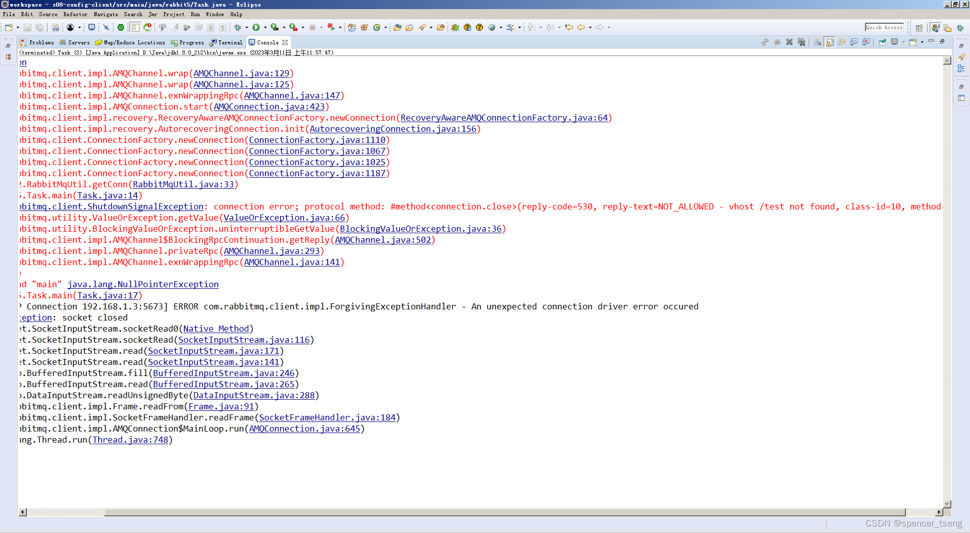 在尝试使用RabbitMQ建立连接时遇到了IOException,具体表现为AMQChannel的wrap方法抛出异常,导致ShutdownSignalException,原因是连接错误,协议方法显示不允许操作(NOT_ALLOWED)。此外,还发生了NullPointerException,在主线程中。这可能是由于RabbitMQ的连接配置问题,如虚拟主机不存在或配置错误所导致。