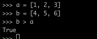 有两个列表:a = [1, 2, 3]和b=[4, 5, 6],在 Python 里面执行b > a会返回 True,如下图所示:
