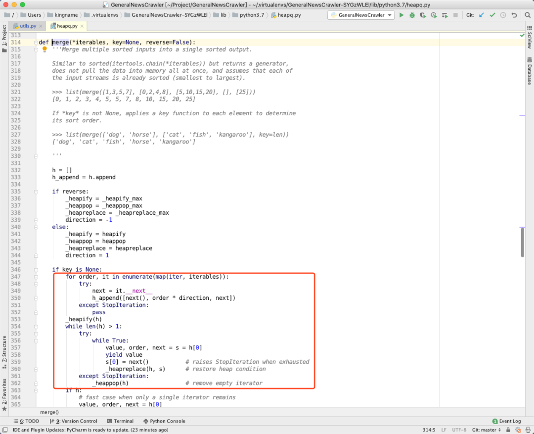 所以,我们来看看 Python 的源代码,看看它是怎么写的。heapq.merge的源代码在Python 的 heapq.py 文件中。你可以在 PyCharm 中,输入: