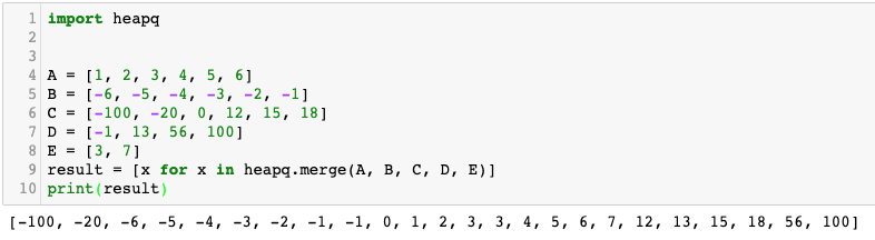 这个算法需求,Python 已经帮我们做好了,那就是heapq.merge(),相关代码如下:
