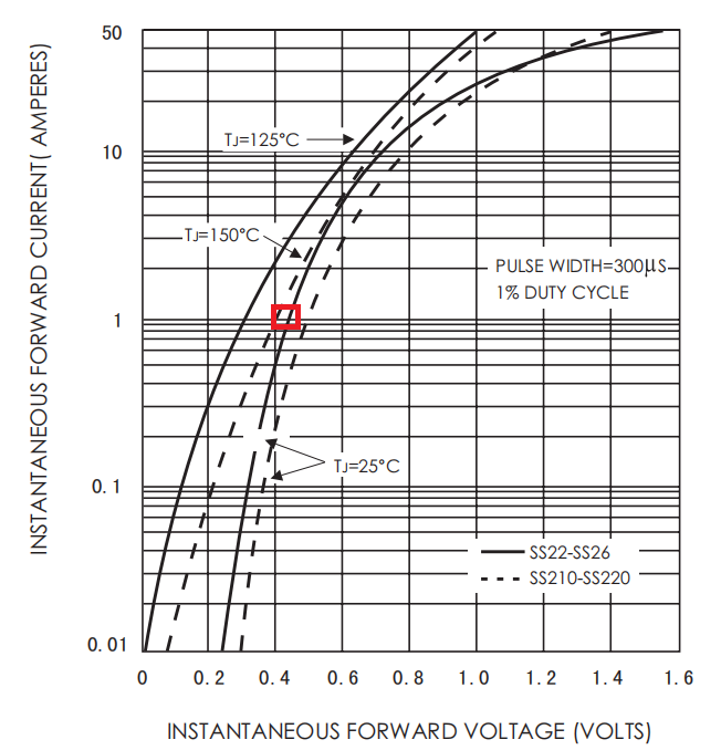 SS24在1A电流下的典型正向压降(VF)约 0.5V(参考下图典型曲线)