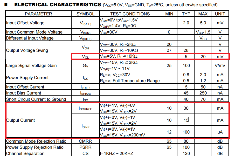 因此,当运放试图输出0V时,下拉晶体管虽然能很好地把输出拉到地电位,但上拉晶体管并未完全关断,仍存在一个微小的导通路径,导致输出无法完全达到0V,而是停留在 Vout_min = Vce_sat 的水平。对于LM358,这个值在数据手册中规定为典型值5mV,最大20mV(在轻负载条件下)。