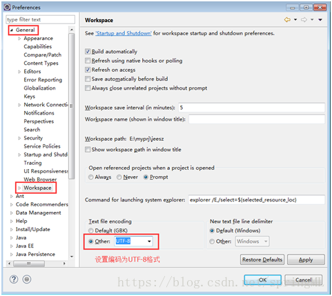 Eclipse工具栏中选择WindowàPrefrencesàGeneralàWorkspace