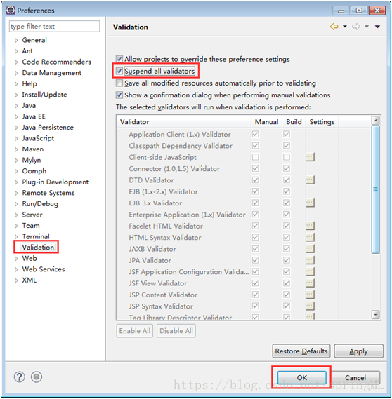 WindowàPrefrencesàValidationàSuspend all validatorsàok