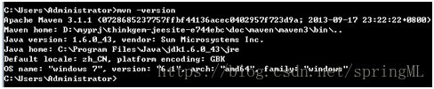mvn 是 maven 的一个指令,mvn -version 是查看版本信息,我的操作系统是 64位的 WIN7,安装的 maven 是 3.1.1,如果能打印如上信息,说明到此 Maven3 已经在你的电脑上安装完成。