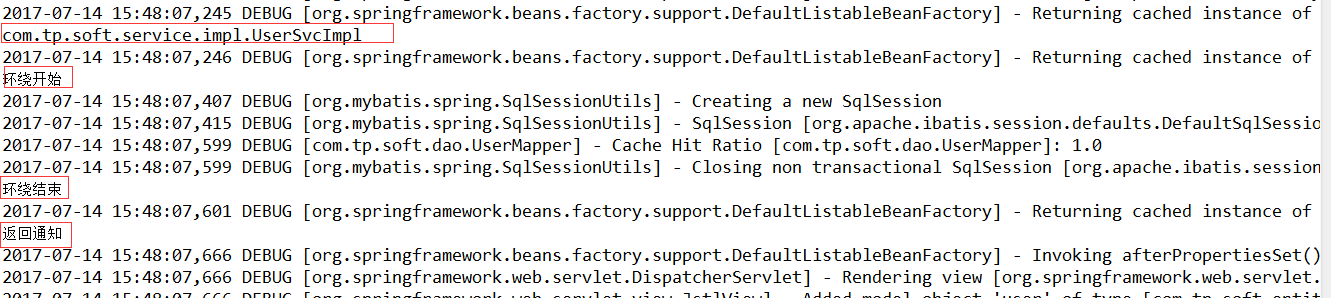 <!-- aop切面类 --> <bean id="loggerAop" class="com.tp.soft.aop.LoggerAop"></bean> <aop:config> <aop:aspect id="loggerAop" ref="loggerAop"> <!-- 正则表达式匹配 --> <aop:pointcut expression="execution(* com.tp.soft.service..*.*(..))" id="mypoint"/> <aop:before method="doBefore" pointcut-ref="mypoint"/> <aop:around method="doAround" pointcut-ref="mypoint"/> <aop:after-returning method="doAfterReturning" pointcut-ref="mypoint"/> <aop:after-throwing method="doAfterThrowing" pointcut-ref="mypoint" throwing="e"/> </aop:aspect> </aop:config>