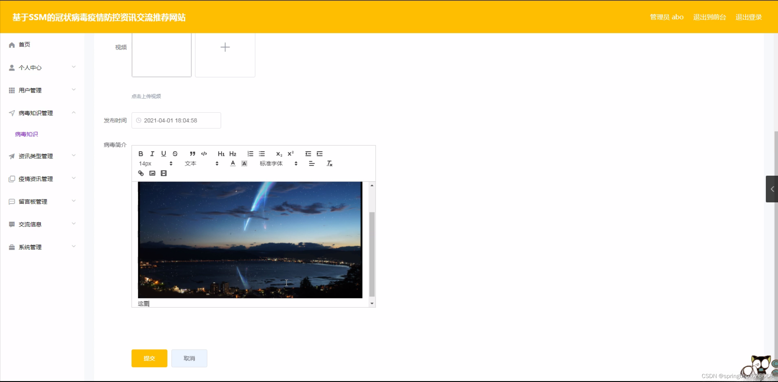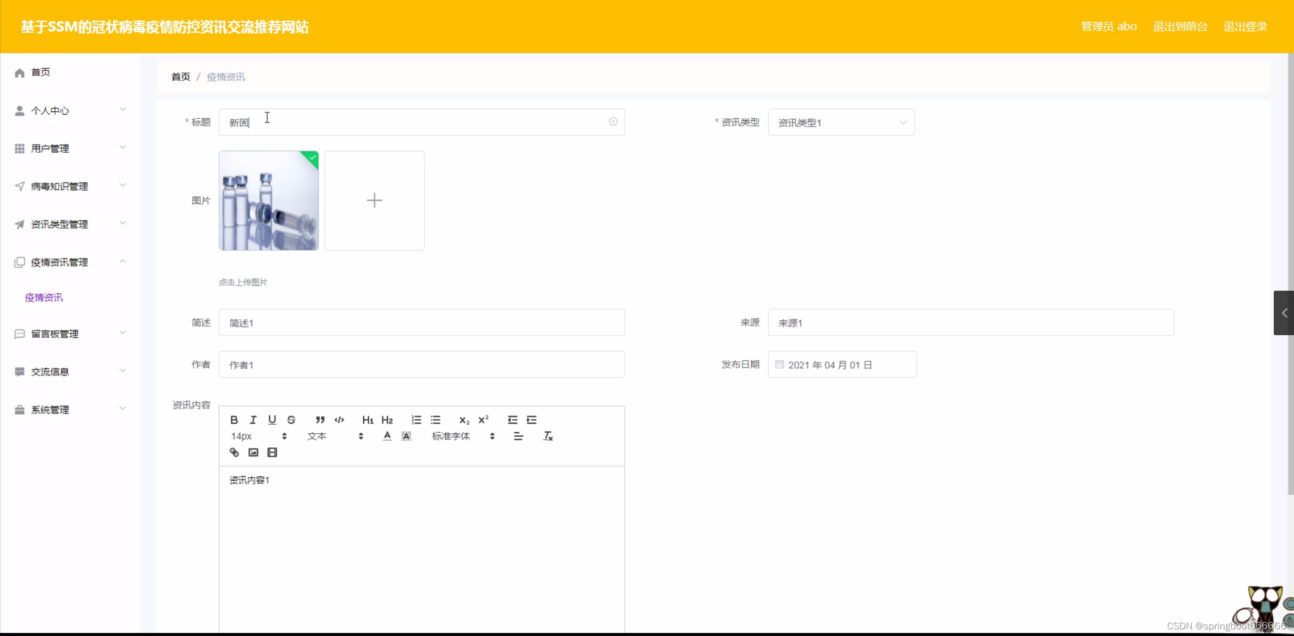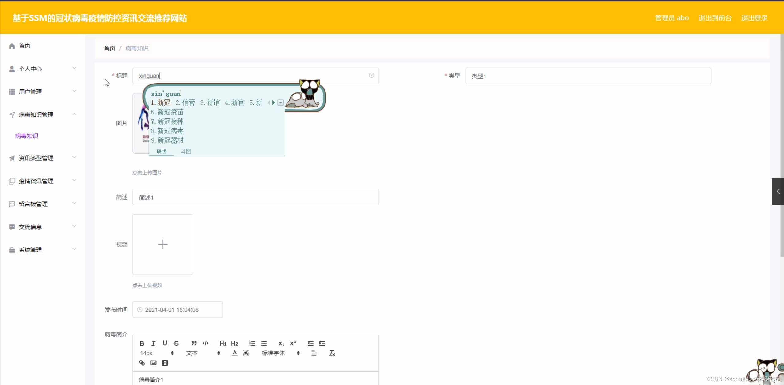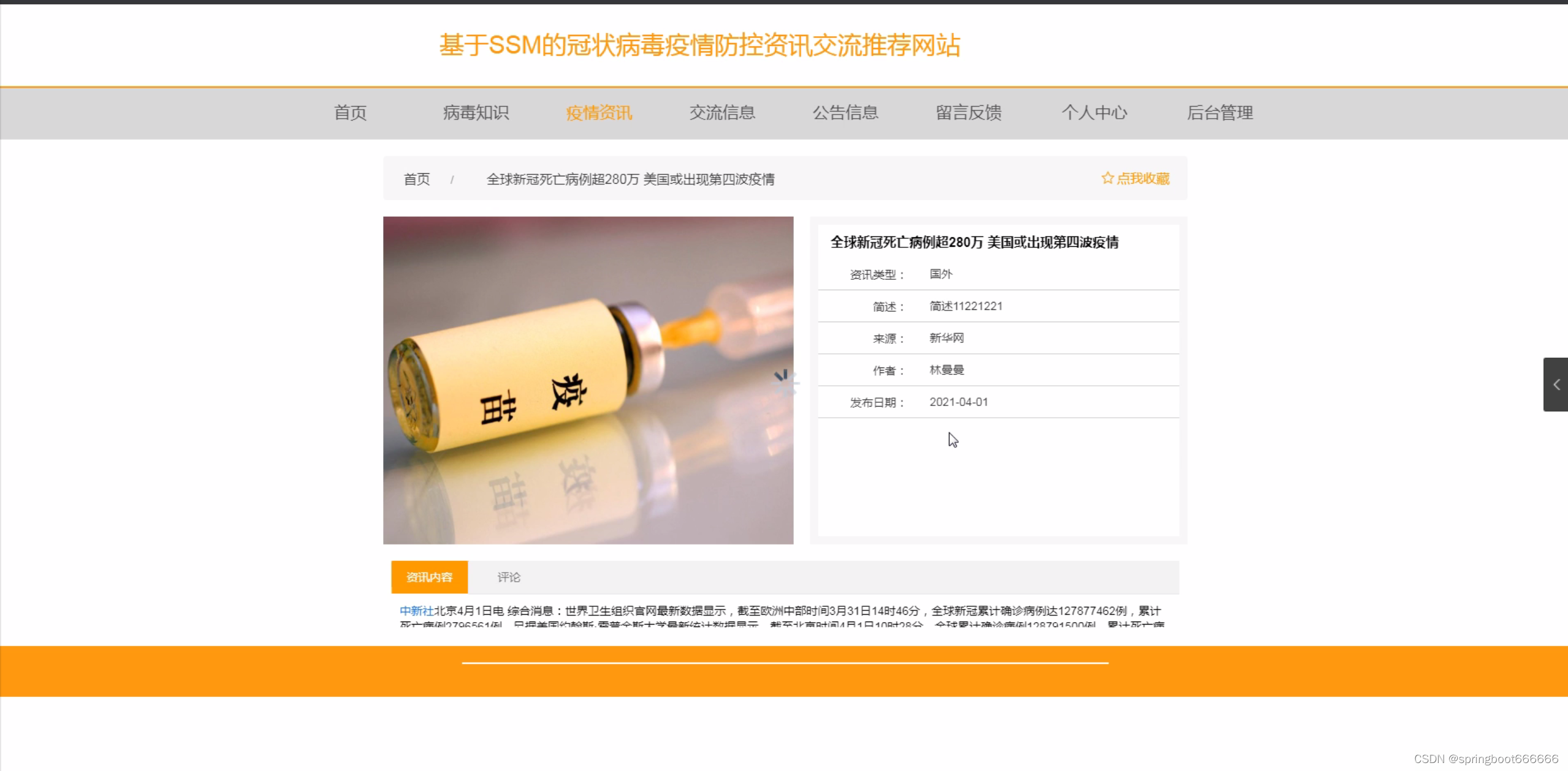 随着全球化的加速,人类社会的交流与互动日益频繁,这也使得各种疾病的传播速度和范围不断扩大。近年来,冠状病毒疫情在全球范围内肆虐,给各国人民的生命安全和经济发展带来了严重威胁。在这种背景下,了解疫情动态、掌握防控知识、分享防疫经验显得尤为重要。然而,面对海量的信息,如何快速找到权威、准确、实用的疫情防控资讯成为了一个亟待解决的问题。因此,建立一个基于冠状病毒疫情防控资讯交流推荐的网站,旨在为广大用户提供一个便捷、高效的信息获取渠道,帮助他们更好地应对疫情挑战。