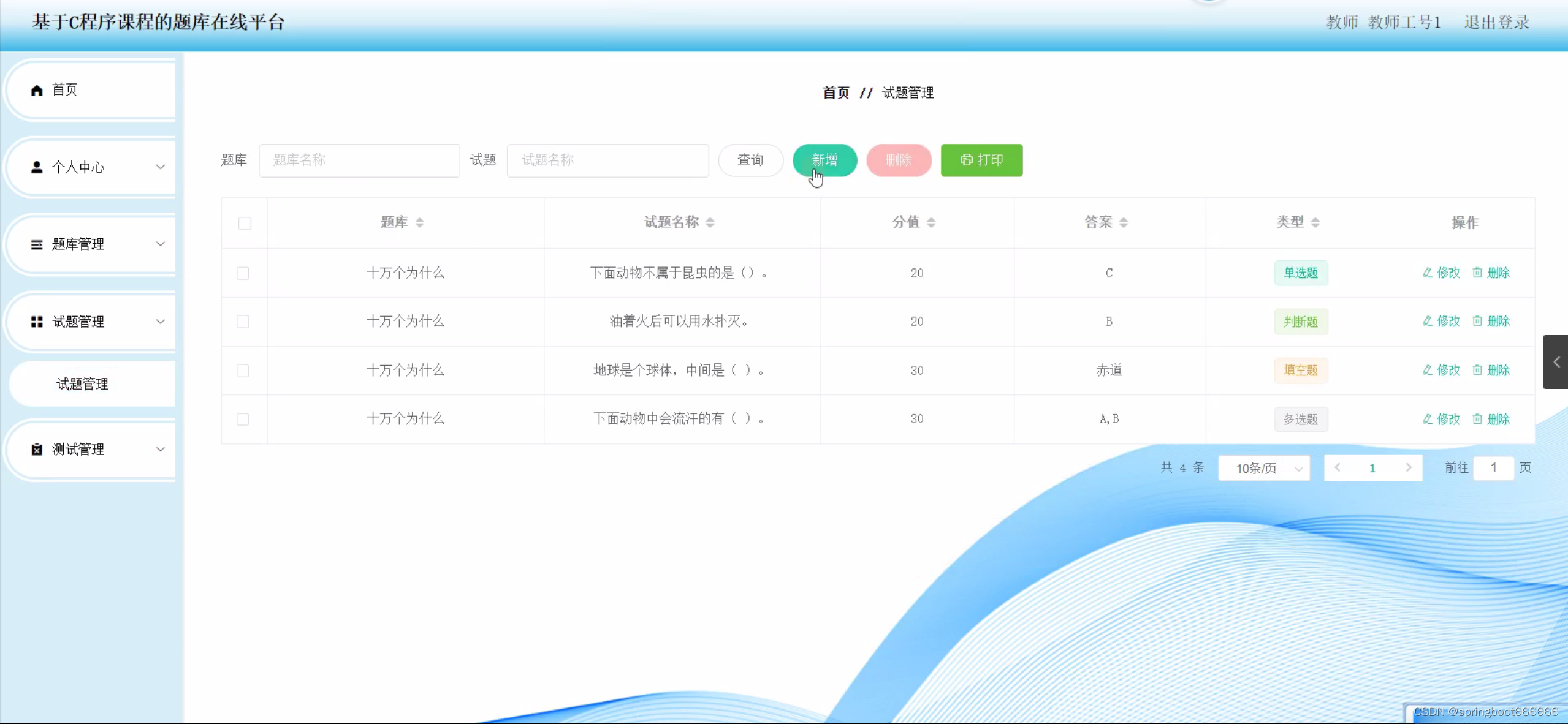 选题背景: 随着计算机技术的不断发展,C语言已经成为了一种广泛使用的编程语言。在许多高校和职业培训机构中,C语言课程都是计算机相关专业的基础课程之一。为了帮助学生更好地掌握C语言知识,提高编程能力,开发一个基于C程序课程的题库在线平台显得尤为重要。该平台可以为学生提供大量的C语言练习题,帮助他们巩固所学知识,提高编程水平。同时,该平台还可以为教师提供一个便捷的教学辅助工具,方便他们布置作业、批改作业以及了解学生的学习情况。