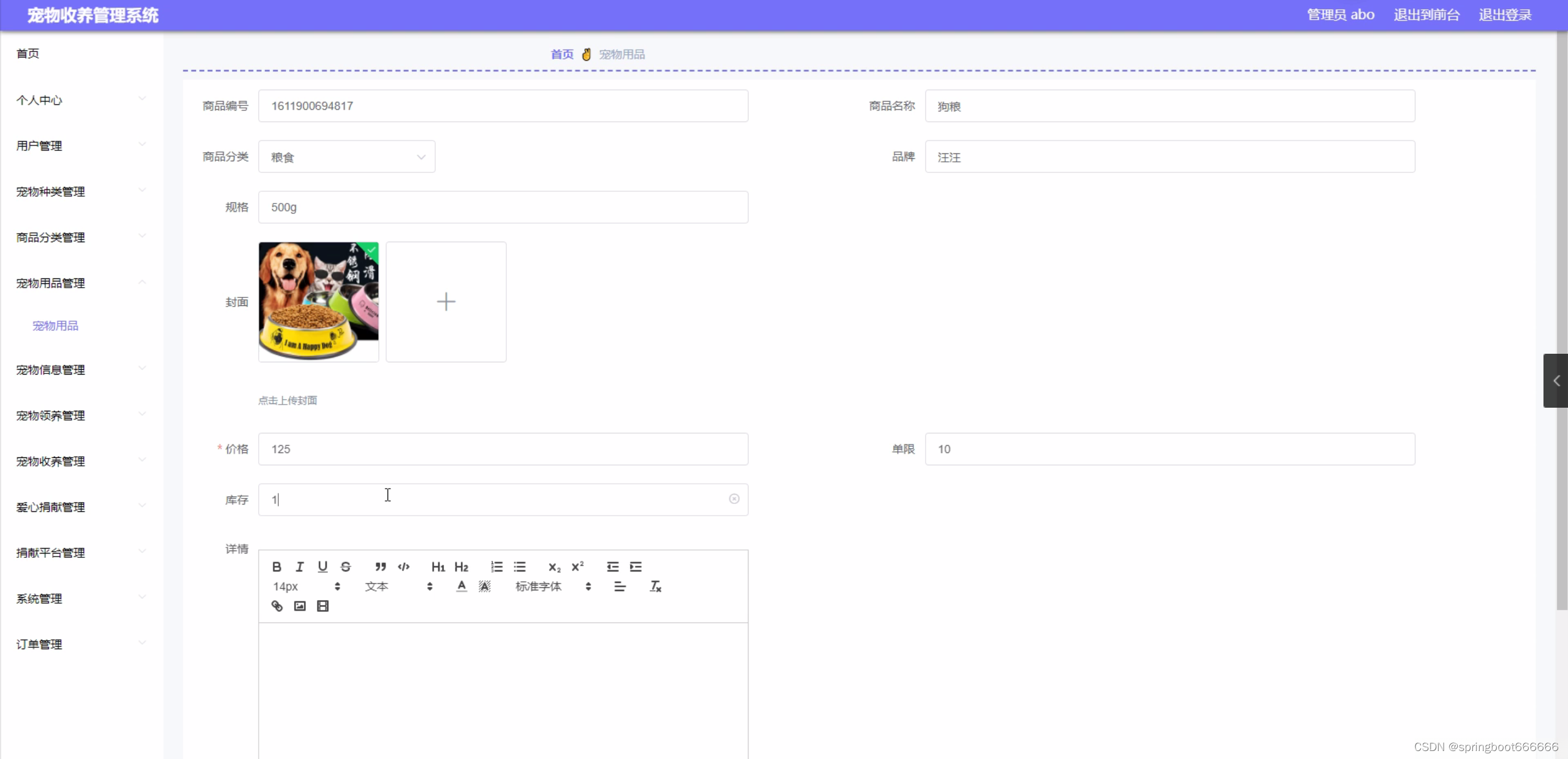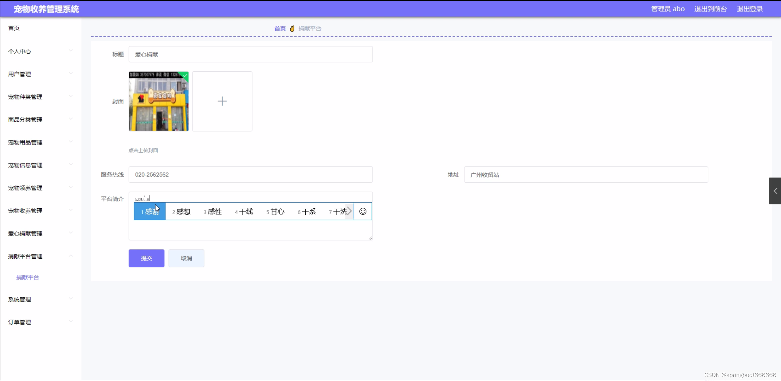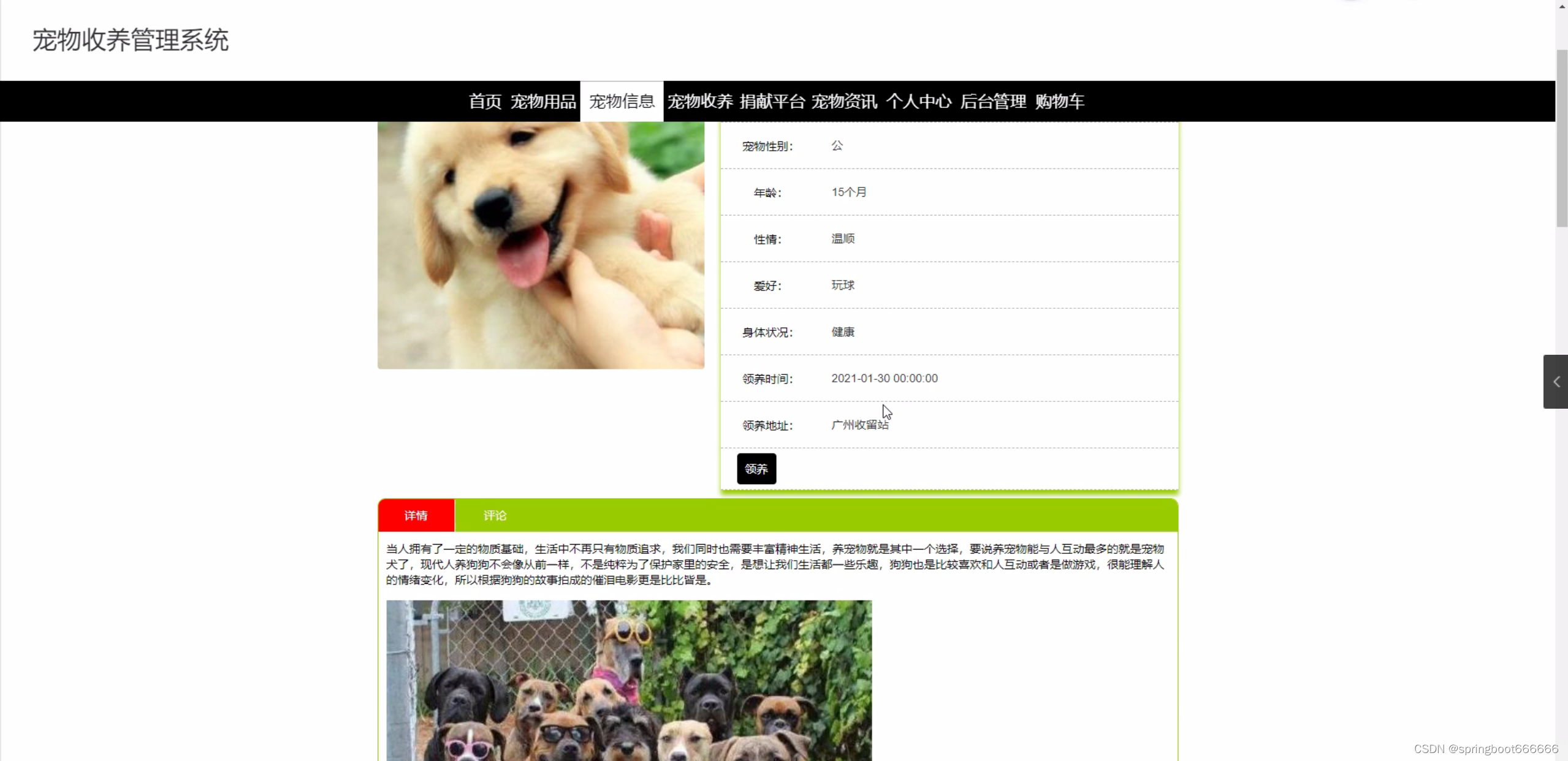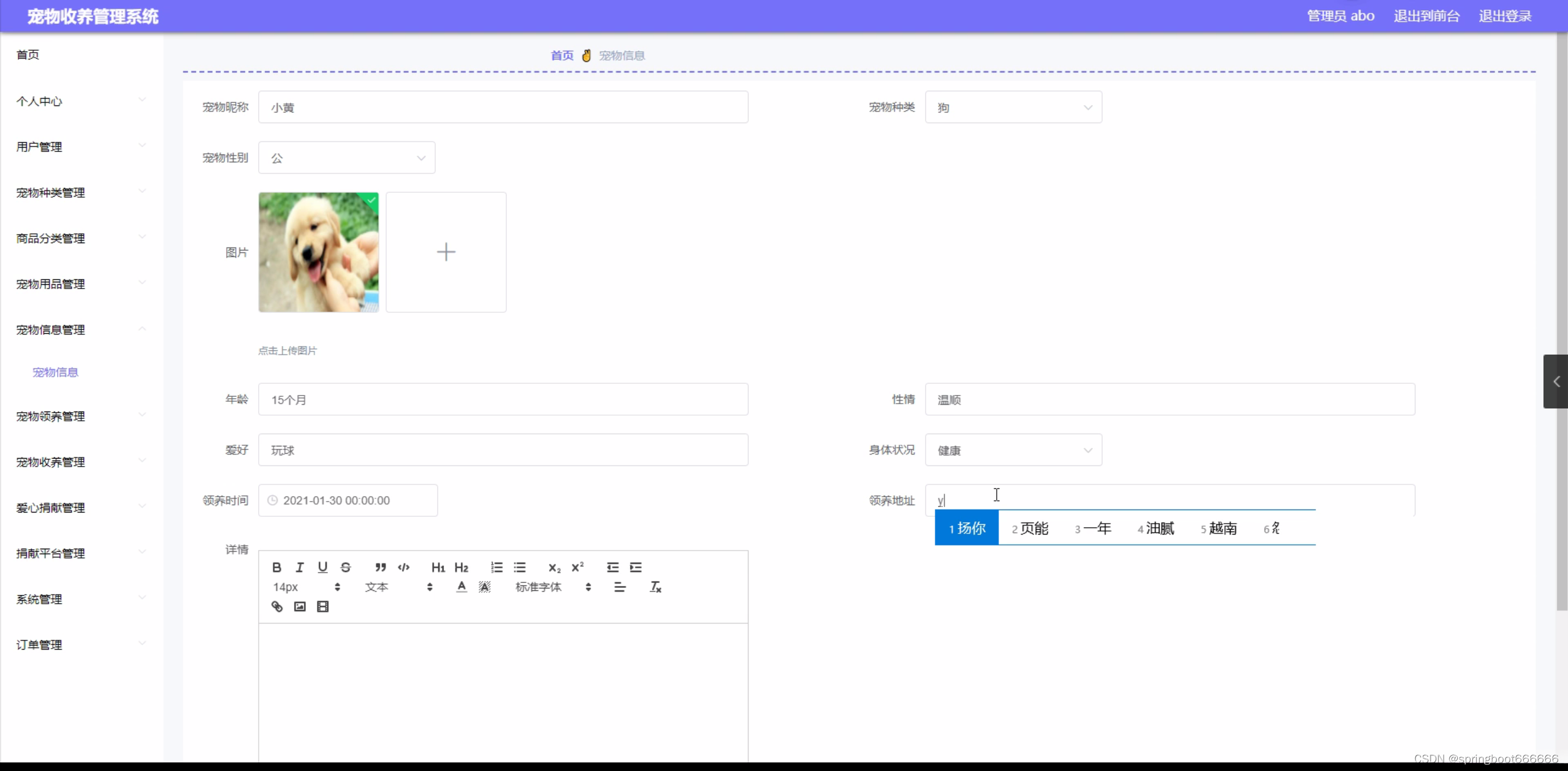 随着社会的发展和人们生活水平的提高,宠物已经成为越来越多家庭的重要成员。然而,在宠物市场繁荣的背后,流浪动物问题日益严重,收容所超负荷运转,许多无家可归的动物面临困境。这一现实情况催生了对宠物收养管理系统的需求。目前,尽管存在一些宠物收养的平台和组织,但整体上缺乏一个统一、高效的管理系统来协调各方面资源,提供全面服务。因此,开发一个集成宠物信息登记、领养流程管理、志愿者协作、捐助追踪等功能于一体的宠物收养管理系统显得尤为迫切。
