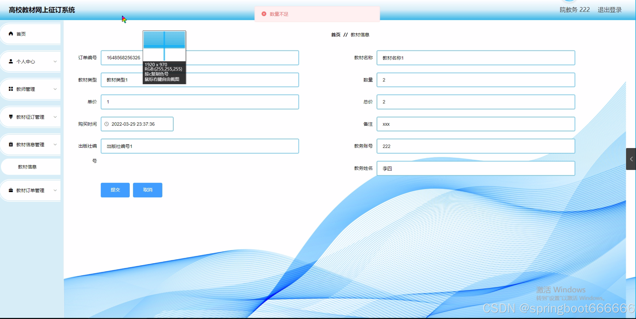 随着信息技术的飞速发展,互联网已经深入到人们生活的方方面面,教育领域亦是如此。传统的高校教材征订方式多依赖于线下操作,学生和教师需要亲自前往书店或教务处进行教材的选择和订购,这一过程不仅耗时耗力,而且效率低下。为了提高教材征订的效率,降低管理成本,并优化资源配置,越来越多的高校开始探索线上教材征订系统的建设和应用。这些系统通常集成了教材信息管理、在线选择、订单处理、支付结算等功能,使得教材征订过程数字化、网络化和智能化。然而,现有系统在用户体验、功能完善度、系统安全性等方面仍有待提升,因此,研究和开发一个高效、安全、易用的高校教材网上征订系统显得尤为重要。