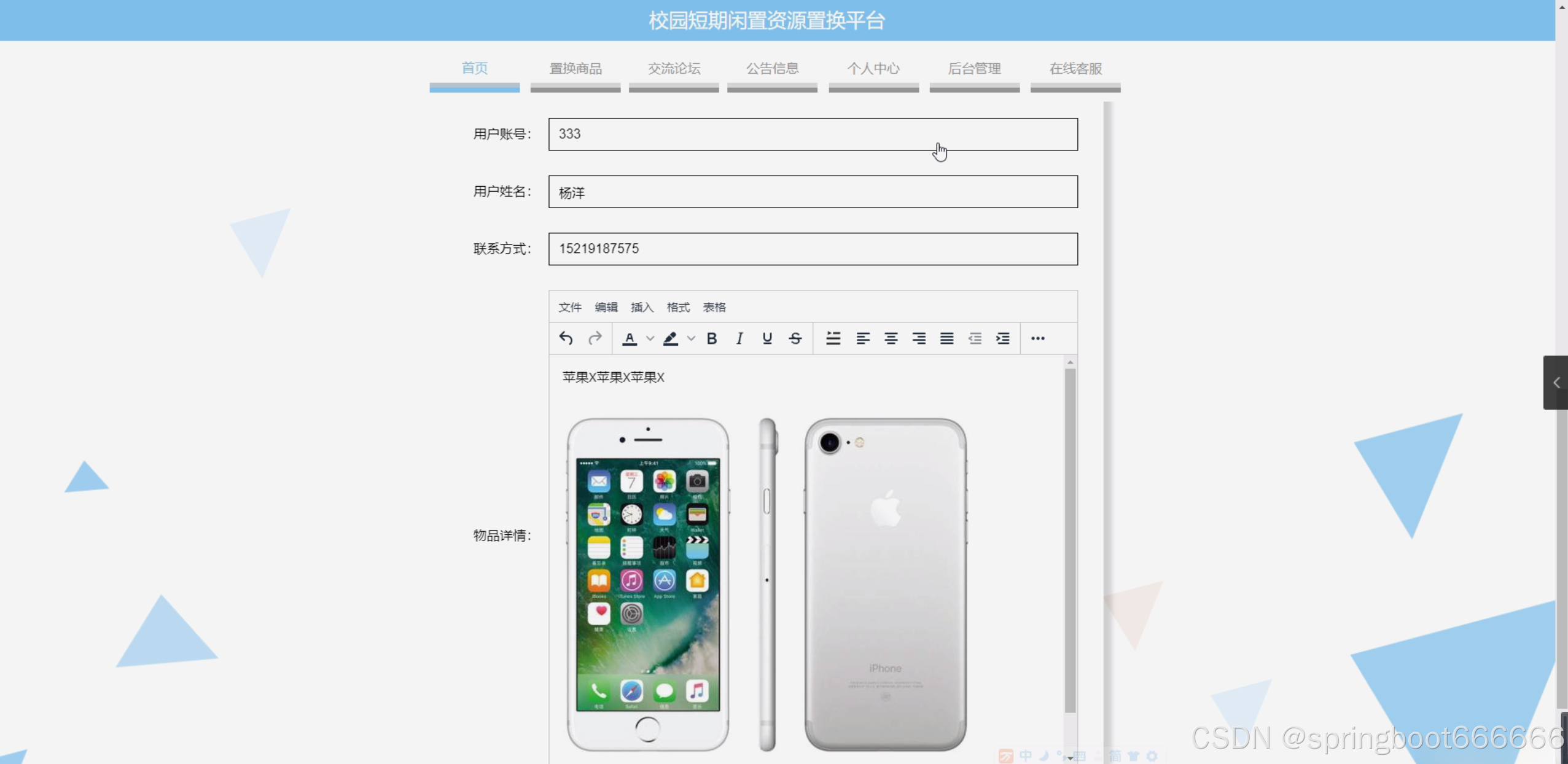 校园短期闲置资源置换平台的建立,可以有效地解决这个问题。首先,这个平台可以为学生提供一个方便、快捷的资源共享平台,使他们能够及时找到自己需要的资源,同时也可以将自己暂时不需要的资源进行置换,实现资源的最大化利用。其次,这个平台也可以为学校提供一个有效的资源管理工具,通过这个平台,学校可以实时了解各个资源的使用情况,及时调整资源的配置,避免资源的浪费。最后,这个平台还可以促进校园内的交流和合作,通过资源的置换,可以增强学生之间的互动和合作,提高他们的社交能力和团队协作能力。因此,建立校园短期闲置资源置换平台具有重要的实践意义和应用价值。