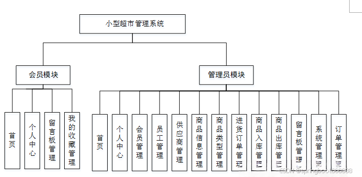 系统架构图属于系统设计阶段,系统架构图只是这个阶段一个产物,系统的总体架构决定了整个系统的模式,是系统的基础。小型超市管理系统的整体结构设计如图4-2所示。