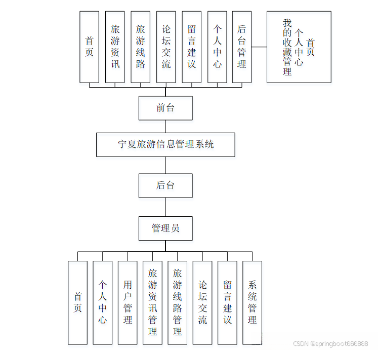 为了更好的去理清本系统整体思路,对该系统以结构图的形式表达出来,设计实现该宁夏旅游信息管理系统的功能结构图如下所示:
