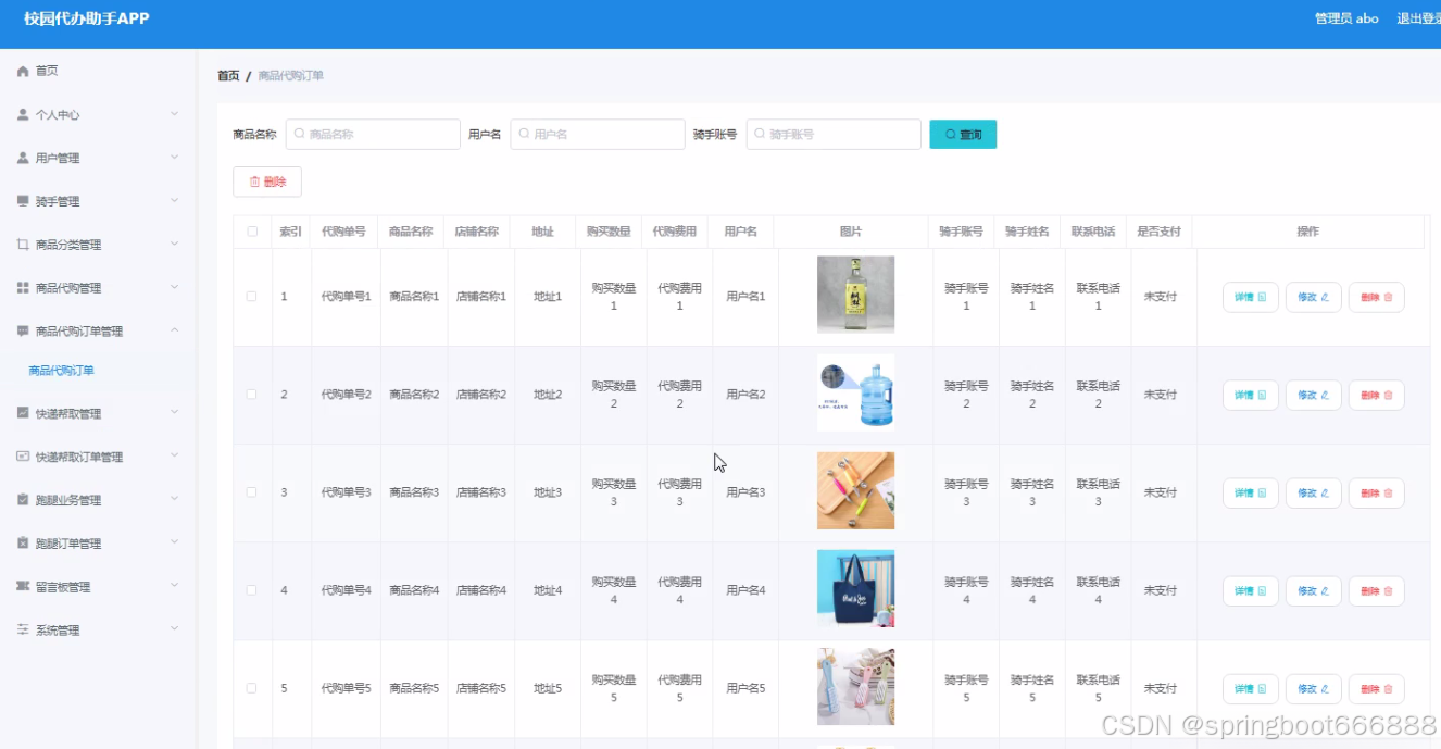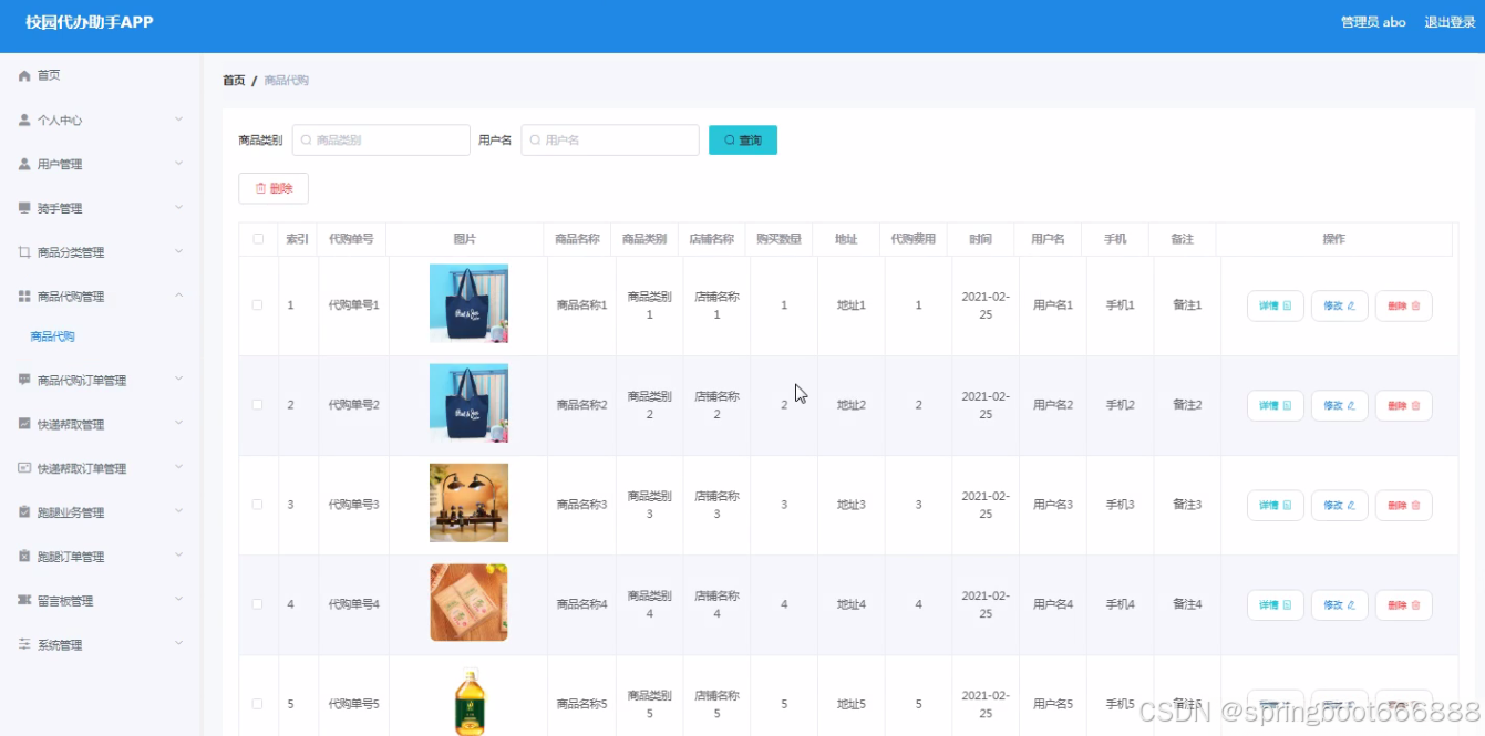 3、详细界面:通过文字图片显示当前的商品代购、快递帮取、跑腿业务等信息;