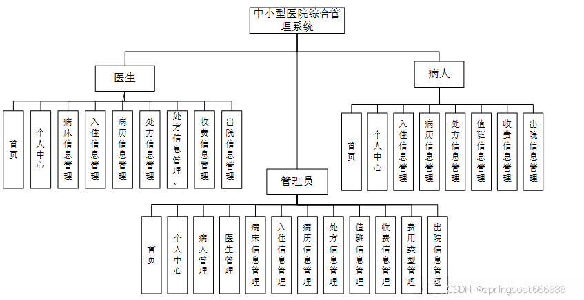 通过市场调研及咨询研究,了解了使用者及管理者的使用需求,于是制定了管理员、医生和病人等模块。其功能结构图如下图4-1所示: