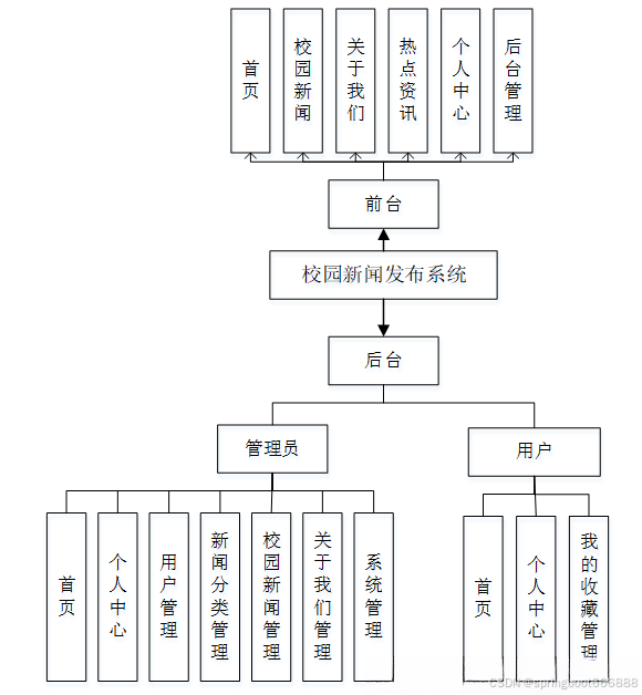 通过市场调研及咨询研究,了解了使用者及管理者的使用需求,于是制定了管理员和用户等模块。其功能结构图如下图4-1所示: