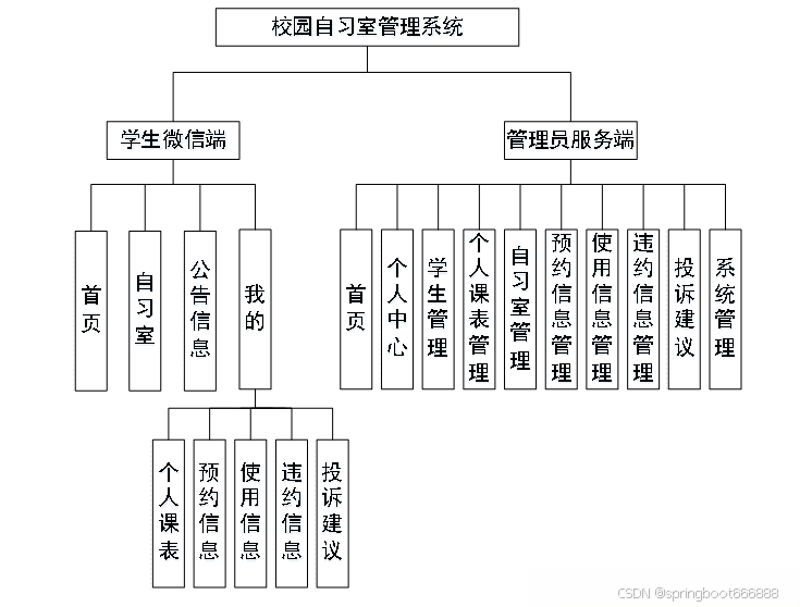 为了更好的去理清本系统整体思路,对该系统以结构图的形式表达出来,设计实现该校园自习室管理系统的功能结构图如下所示: