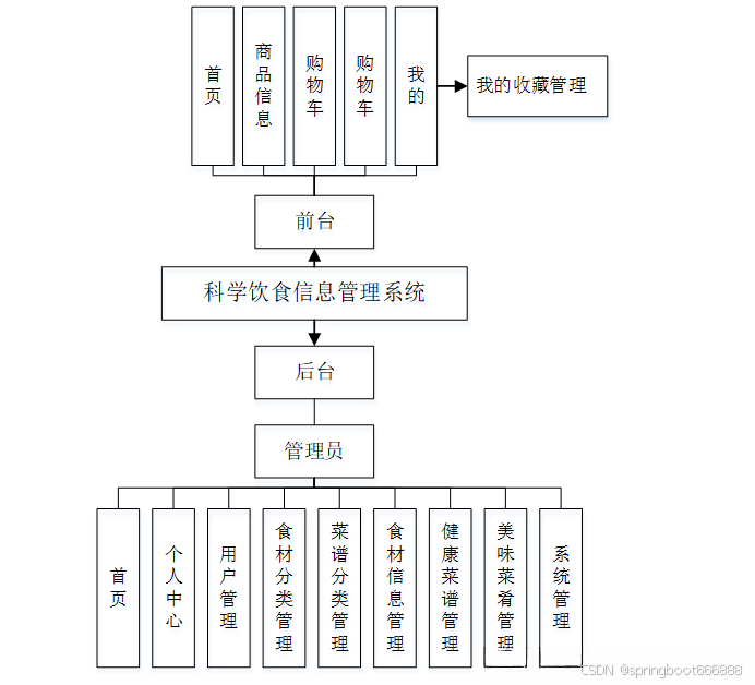 为了更好的去理清本系统整体思路,对该系统以结构图的形式表达出来,设计实现该科学饮食信息管理系统的功能结构图如下所示: