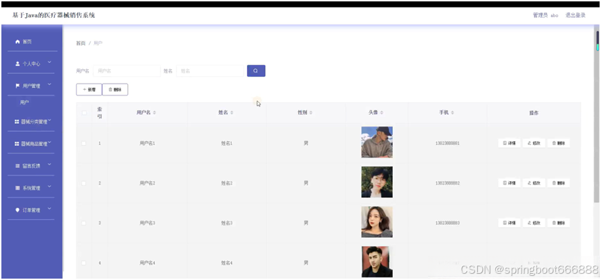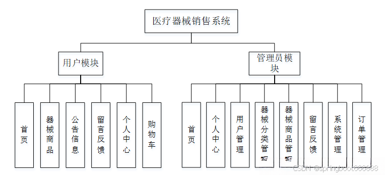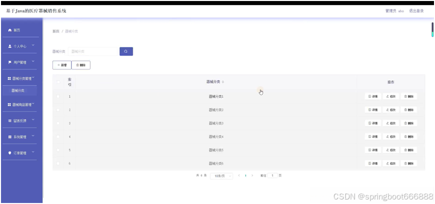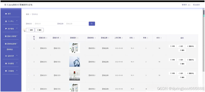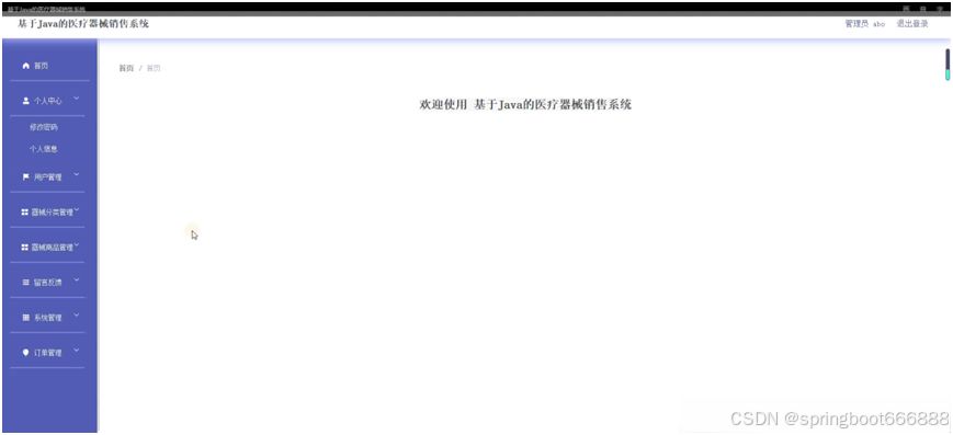 后台主要是管理员,管理员功能包括首页、个人中心、用户管理、器械分类管理、器械商品管理、留言反馈、系统管理、订单管理等;