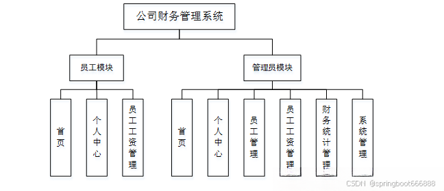 为了更好的去理清本系统整体思路,对该系统以结构图的形式表达出来,设计实现该公司财务管理系统的功能结构图如下所示: