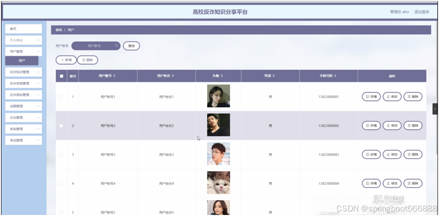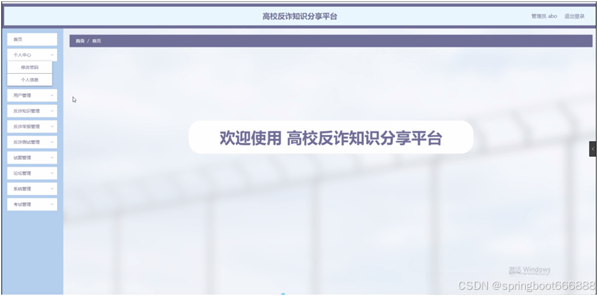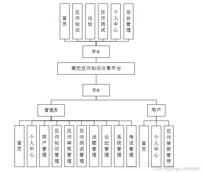 为了更好的去理清本系统整体思路,对该系统以结构图的形式表达出来,设计实现该高校反诈知识分享平台的功能结构图如下所示:
