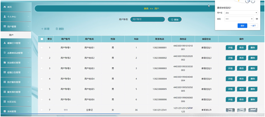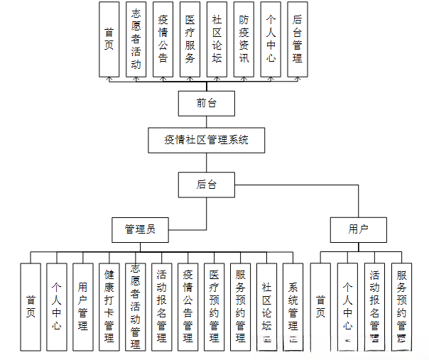 疫情社区管理系统主要有两类用户。分别是管理员和用户,详细规划如图4-1所示。