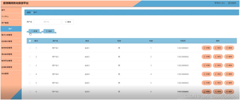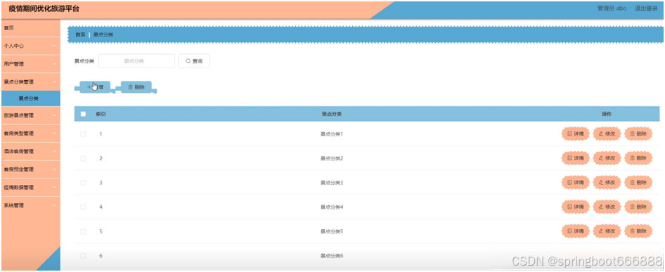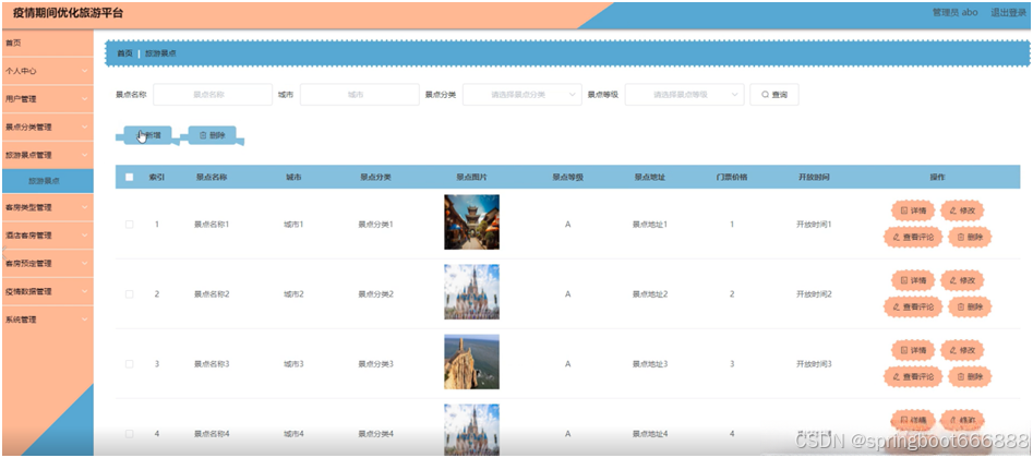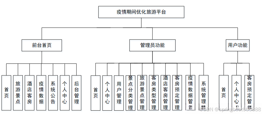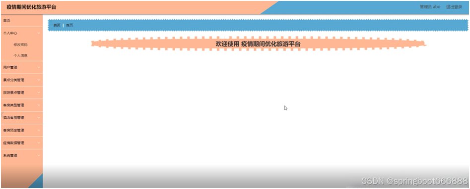 后台主要是管理员,管理员功能包括首页、个人中心、用户管理、景点分类管理、旅游景点管理、客房类型管理、酒店客房管理、客房预定管理、疫情数据管理、系统管理等;