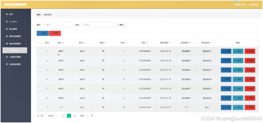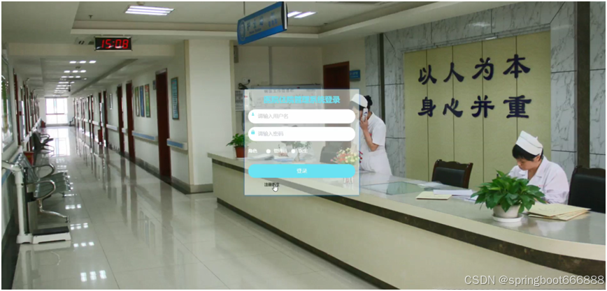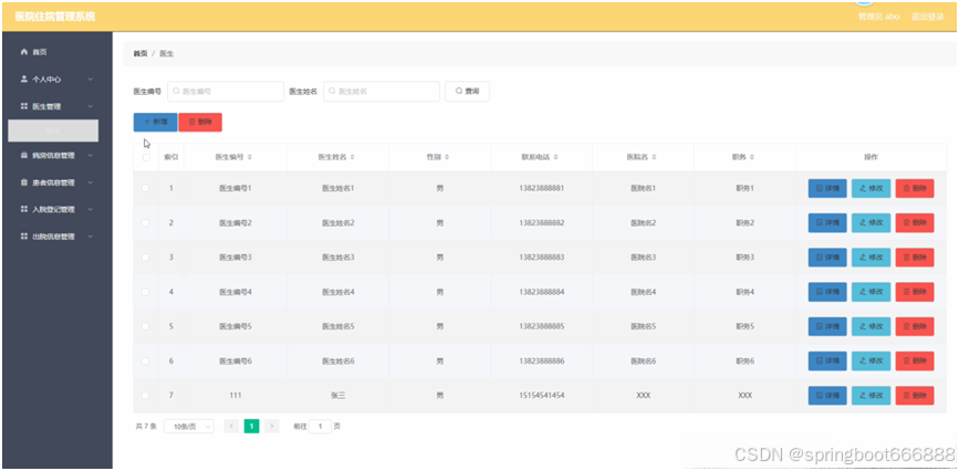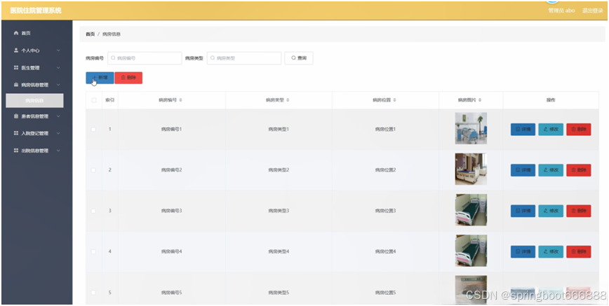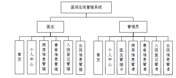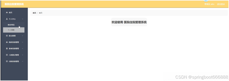 后台由管理员,医生两个角色组成,主要功能包括首页,个人中心,医生管理,病房信息管理,医生信息管理,入院登记管理,出院信息管理等;