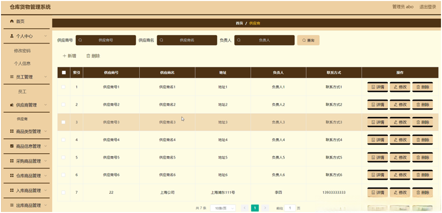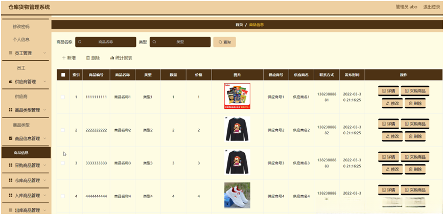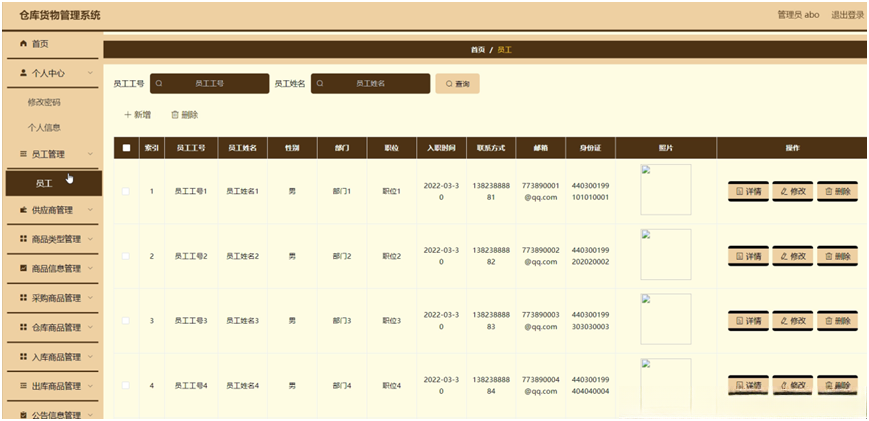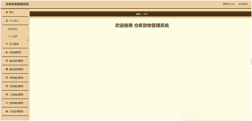 管理员功能模块为管理员操作界面,主要包括个人中心、员工管理、供应商管理、商品类型管理、商品信息管理、采购商品管理、仓库商品管理、入库商品管理、出库商品管理、公告信息管理等功能。